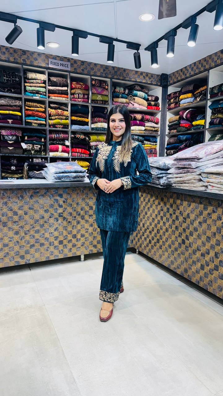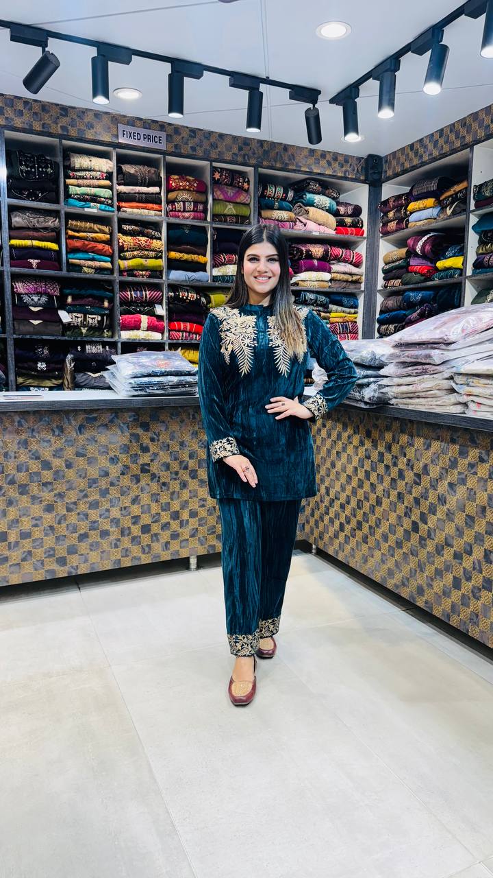Premium Imported Velvet se tayyar yeh Teal Leafy 2-piece set deep rich teal colour ke sath ek royal glow deta hai. Shirt par ki gayi golden leafy embroidery outfit ka main highlight hai, jo isko festive aur premium gatherings ke liye perfect banati hai. Velvet ka sheen, colour ki depth aur leaf-pattern detailing milkar ek luxurious, statement look create karte hain.