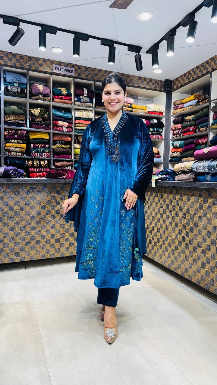 An enchanting premium velvet 3-piece suit in a mesmerizing royal teal blue shade that embodies winter luxury and timeless grace. The soft, lustrous velvet fabric drapes beautifully, exuding richness with every move. The delicate tonal embroidery with sequin highlights along the neckline and lower panels adds a sophisticated shimmer. Paired with a matching velvet pant and dupatta adorned with lace detailing, this outfit perfectly blends regal opulence with modern charm, ideal for weddings, receptions, or evening festivities.