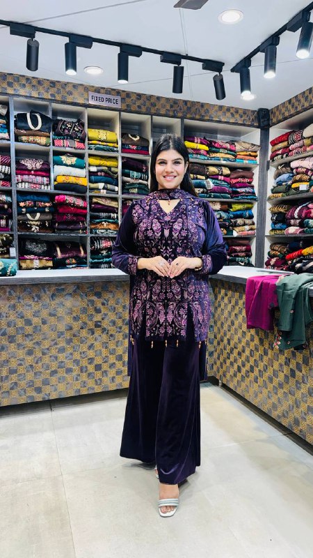 The velvet fabric gives a smooth, fluid fall, while the straight-cut velvet pants maintain a polished silhouette. The matching dupatta completes the look with understated elegance, keeping the focus on texture and depth rather than excess shine.