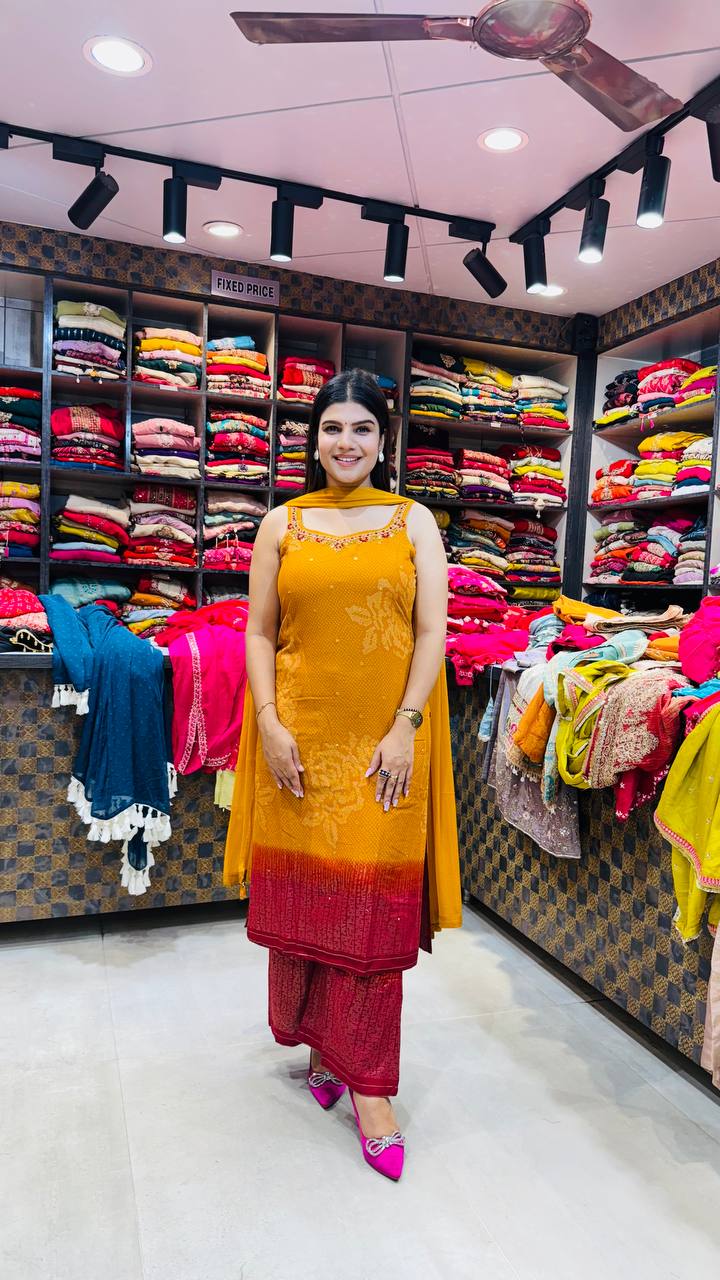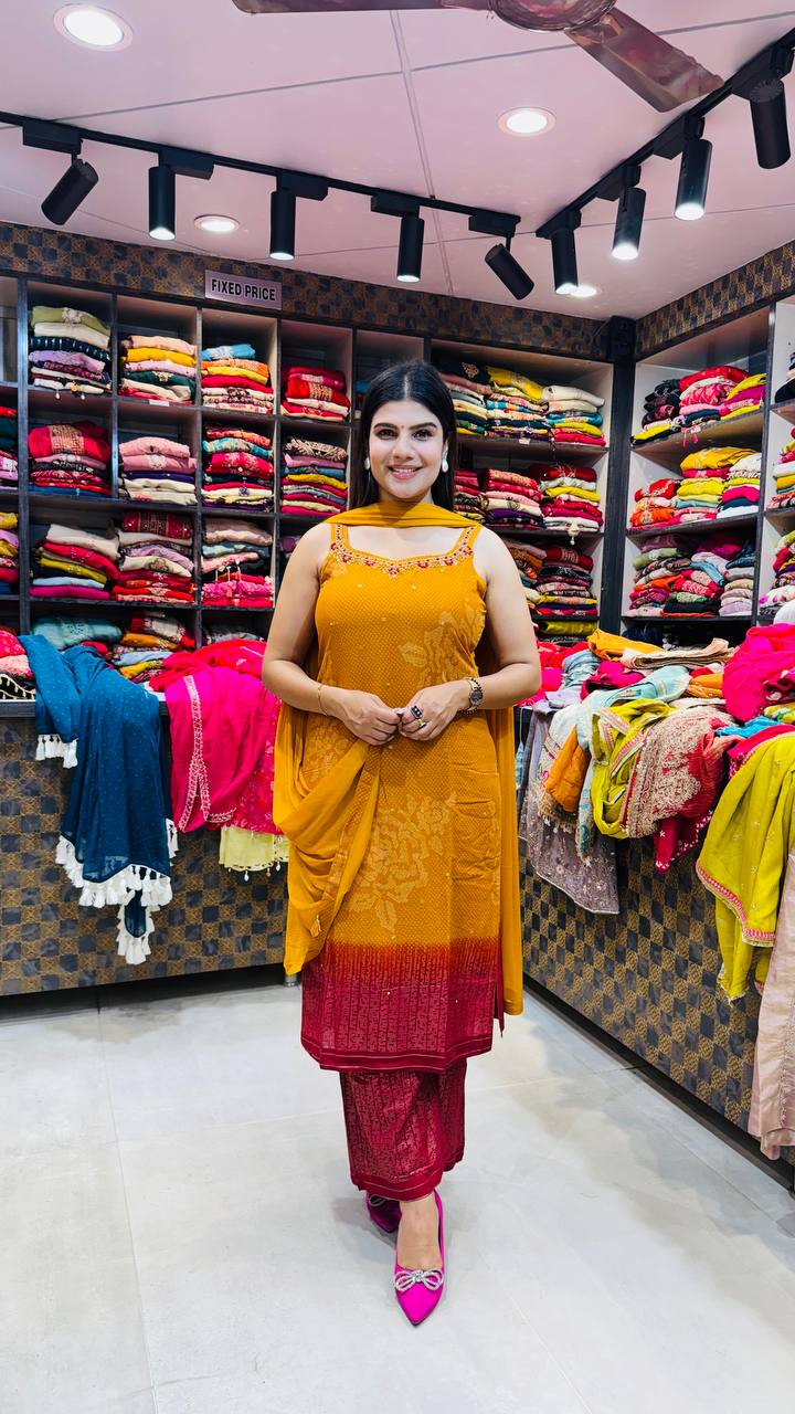 This elegant 3-piece suit is crafted from pure cotton fabric, blending comfort with festive appeal. The shirt features a mustard yellow to deep maroon ombrΓ© effect, highlighted with subtle woven patterns and delicate embroidery on the neckline. Paired with a rich maroon jacquard pant and a matching mustard cotton dupatta, the set radiates a vibrant yet graceful charm. Perfect for traditional gatherings, daytime festivities, or semi-formal occasions.