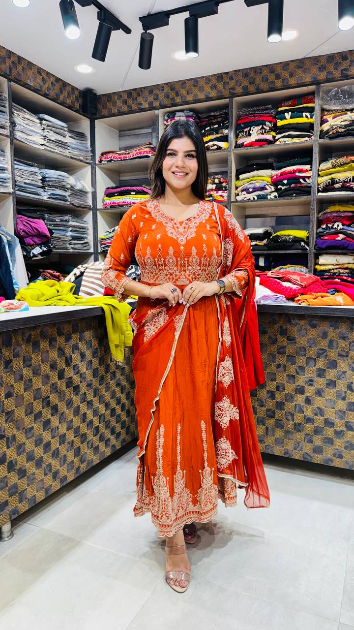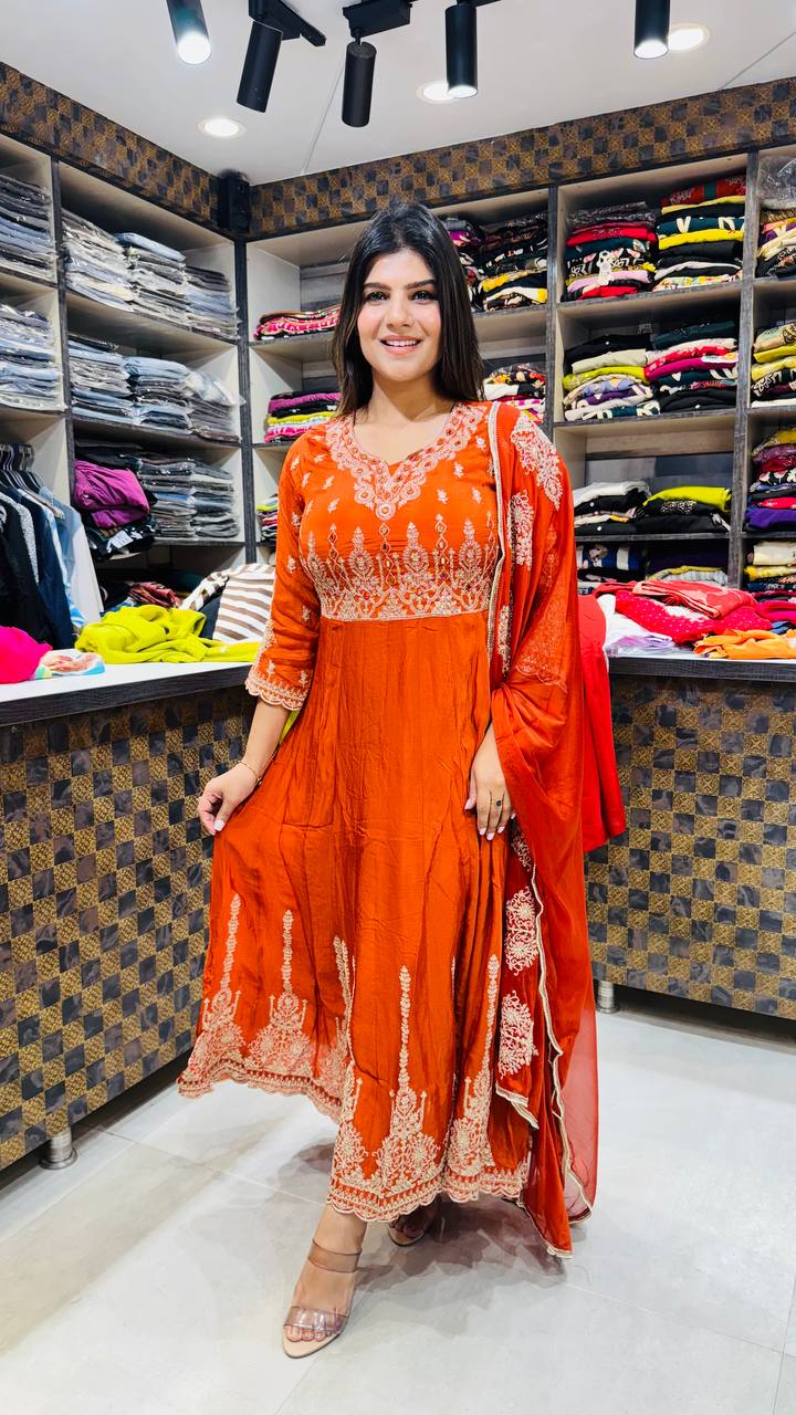 A graceful Chinon suit in a vibrant amber-orange shade, enhanced with detailed cream thread embroidery across the neckline, hemline, and dupatta. The kurta features elegant motifs with traditional patterns, paired with a matching dupatta carrying heavy embroidered designs for a complete festive look. The soft Chinon fabric adds flow and charm, making it ideal for celebrations and ethnic gatherings.