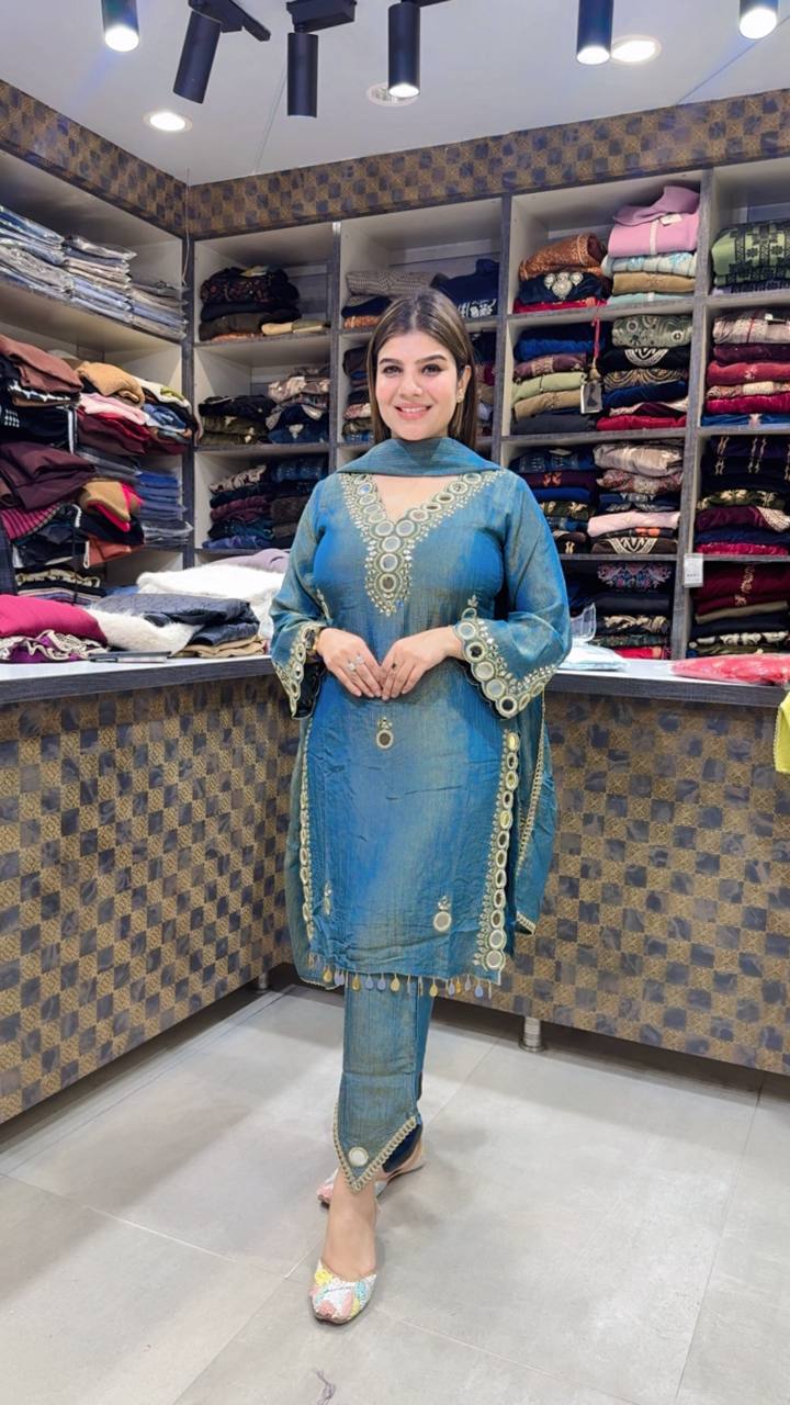 Arelia is a Premium Crush Tissue 3-Piece suit crafted in a refined teal-blue tone with a soft metallic sheen. The shirt features delicate circular embroidery around the neckline, sleeves, and side panels, creating a graceful flow with subtle texture.