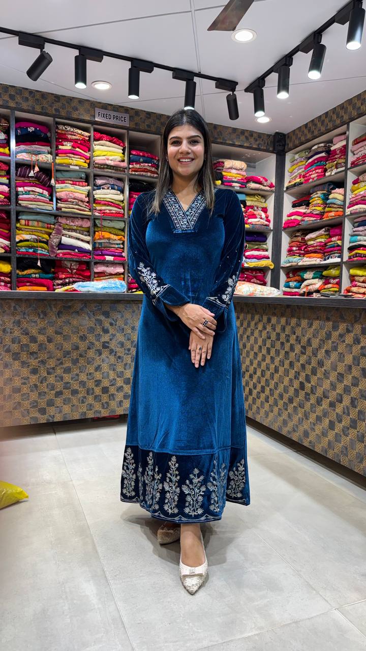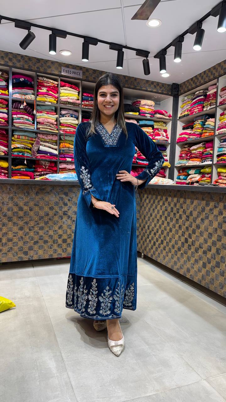 A rich azure blue long kurti crafted from premium imported velvet, featuring elegant silver thread embroidery on the neckline, sleeves, and hem. The fabric has a luxurious shine and soft fall, giving the outfit a royal winter look. Perfect for festive evenings, parties, and elegant gatherings.