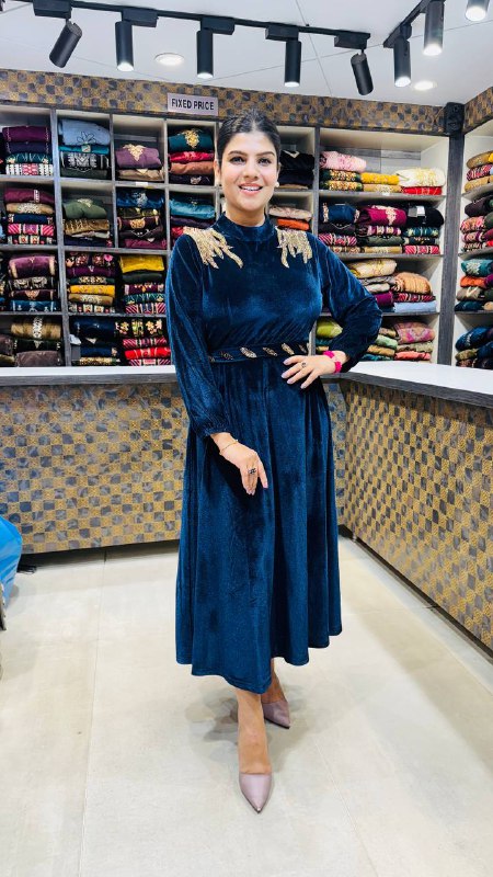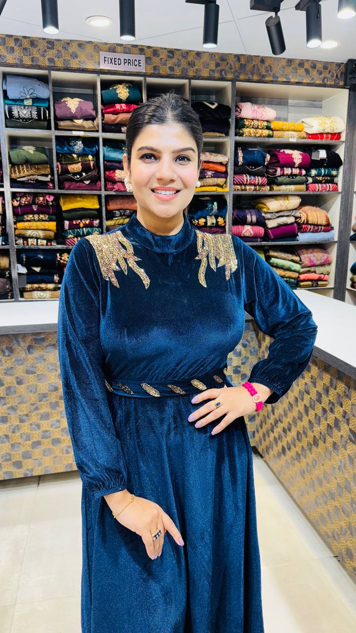 A captivating premium velvet dress in a deep azure blue tone, exuding sophistication and subtle glamour. The golden thread embroidery on the shoulders and waistline elevates the look with a refined contrast, while the flowy midi-length silhouette and high-neck detailing create a poised and graceful statement. Ideal for cocktail evenings, festive gatherings, or winter celebrations where elegance speaks louder than sparkle.