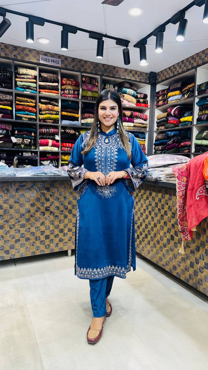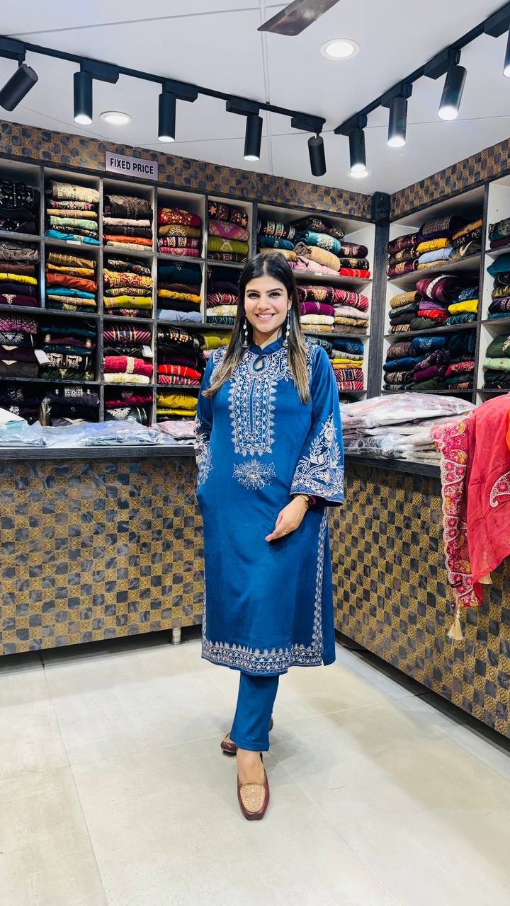 A winter-classic Premium Velvet Phiran Set in a striking Azure Blue tone, highlighted with detailed Kashmiri-style embroidery that gives it a timeless cultural charm.
