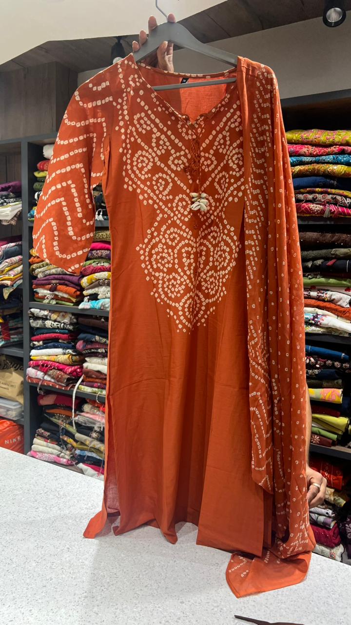 A stunning rust orange 3-piece suit set crafted from premium cotton, designed to blend traditional elegance with everyday comfort. The kurti features beautiful Bandhani-inspired dotted motifs arranged in graceful ethnic patterns across the front, giving it a rich handcrafted look. The neckline is enhanced with delicate tassel detailing, adding a charming traditional touch. Paired with matching pants and a coordinated dupatta adorned with scattered Bandhani prints, this outfit offers a breathable and soft feel while maintaining a stylish ethnic appeal. Perfect for casual outings, festive moments, and effortless everyday elegance.