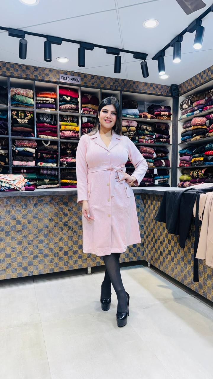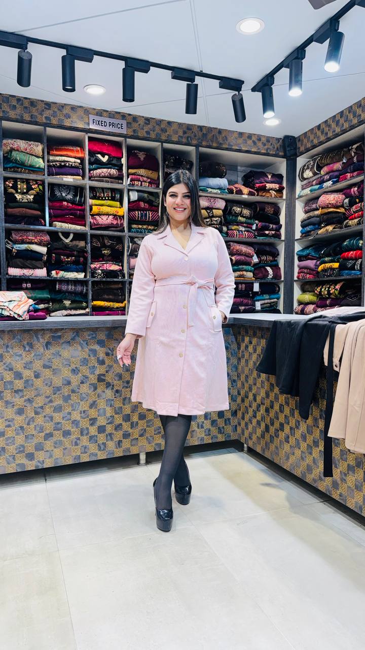 A soft blush pink winter coat crafted from premium imported fabric, designed with a classic lapel collar, waist tie belt, and gold-tone button detailing for an effortlessly elegant winter look. The mid-length silhouette, full sleeves, and roomy front pockets make it both stylish and functional — perfect for cozy winter outings, office wear, and minimal chic fashion lovers.
