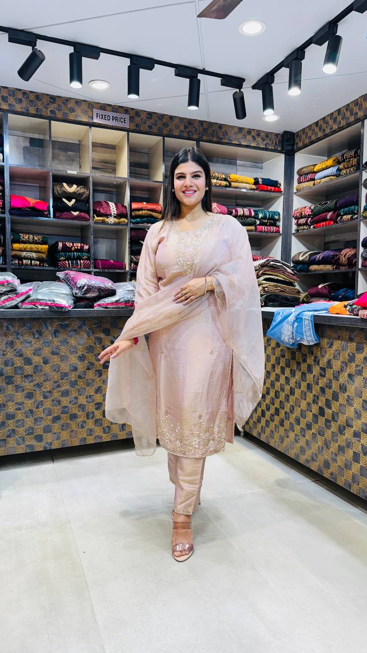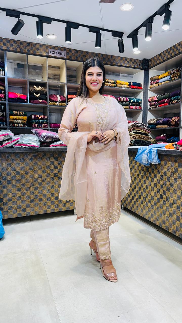 Grace meets glamour in this stunning blush pink shimmer silk suit set. The kurta features delicate golden thread embroidery on the neckline and hemline, adding a soft yet regal glow to the outfit. Paired with a matching straight pant and a lightweight organza dupatta, this ensemble radiates effortless elegance. Perfect for festive gatherings, weddings, or evening events — this piece adds just the right touch of shimmer without being overpowering.
