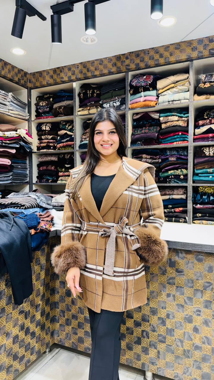 β¨ Design: Plaid Check β’ Belted Waist β’ Faux Fur Cuffs β’ Structured Fit