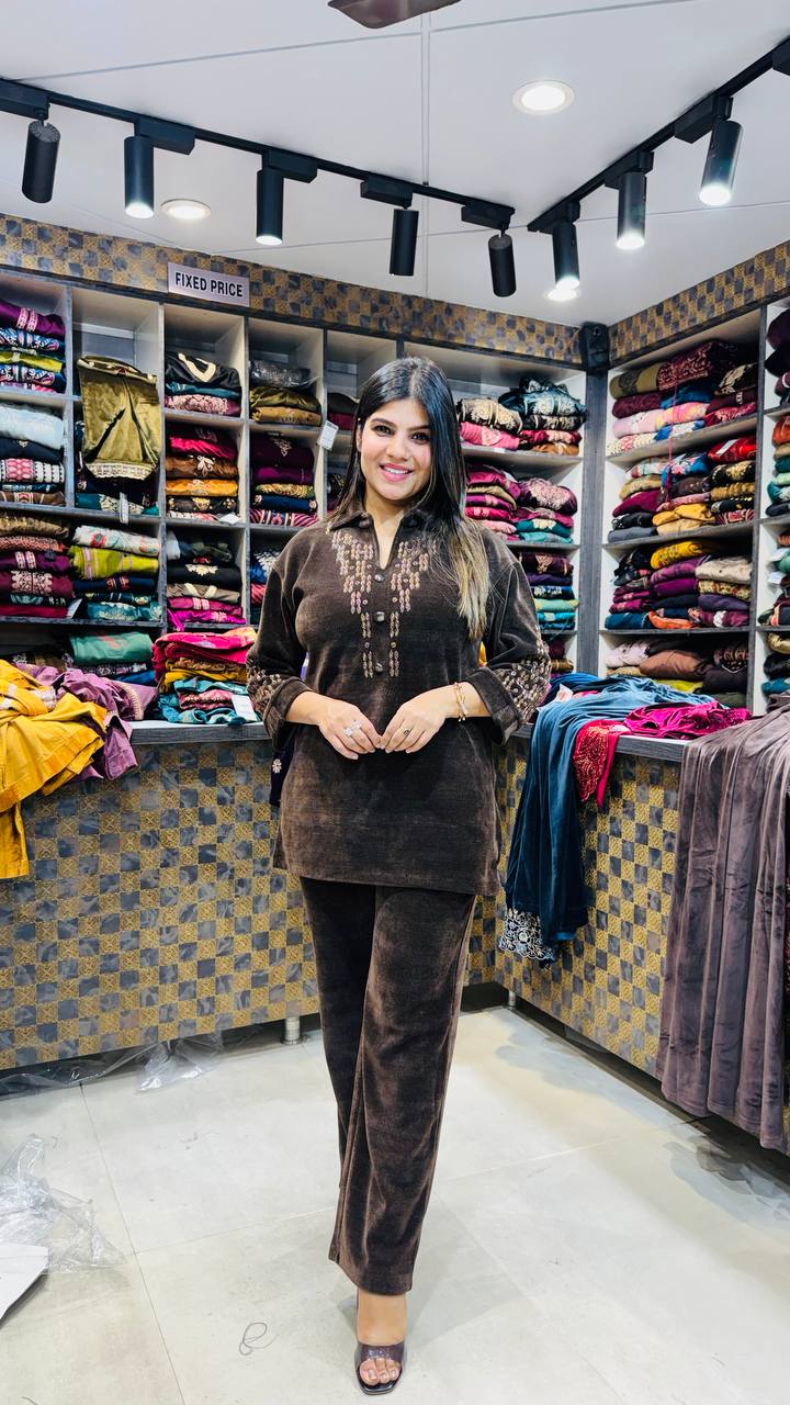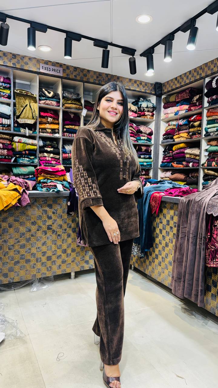 Cacao is a Premium Imported Warm 2-Piece set crafted in a deep chocolate-brown tone with a soft matte finish. The shirt features subtle vertical embroidery on the front and refined detailing along the sleeves, adding quiet elegance without overpowering the look.