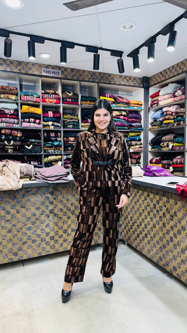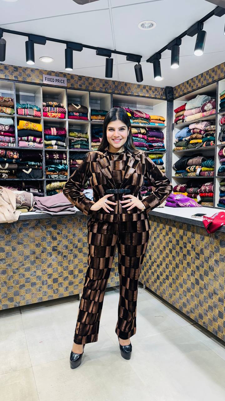 Caffè is a Premium Velvet 3-Piece set crafted in a rich coffee-brown palette with a bold geometric block pattern that gives it a modern, high-fashion edge. The velvet shirt features a structured silhouette with a cinched waist belt, creating a sharp and confident look while maintaining warmth and comfort.