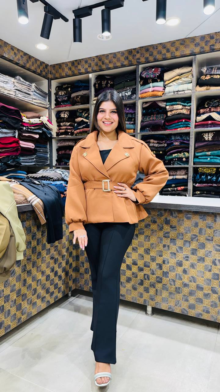 Caramelia is a Premium Warm Blazer crafted in a rich caramel tan shade that feels polished and winter-appropriate. The blazer features a structured lapel collar with a defined waistline, enhanced by a matching belt buckle detail that adds shape without looking bulky.