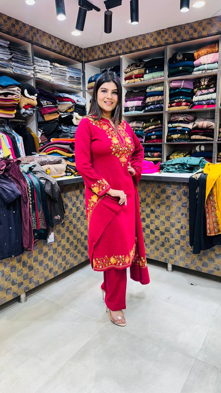 A bold and elegant Crimson Red 3-piece winter suit crafted from Premium Imported soft, warm & lint-free fabric. The kurti features golden-yellow floral thread embroidery on the neckline, sleeves, and hem—giving it a rich, traditional festive finish. Paired with matching straight pants and a coordinated dupatta adorned with embroidered floral motifs, this set delivers a warm, vibrant, and luxurious winter look.