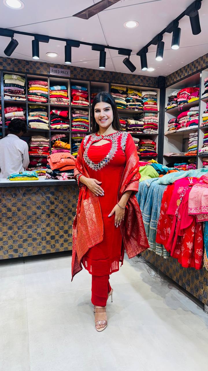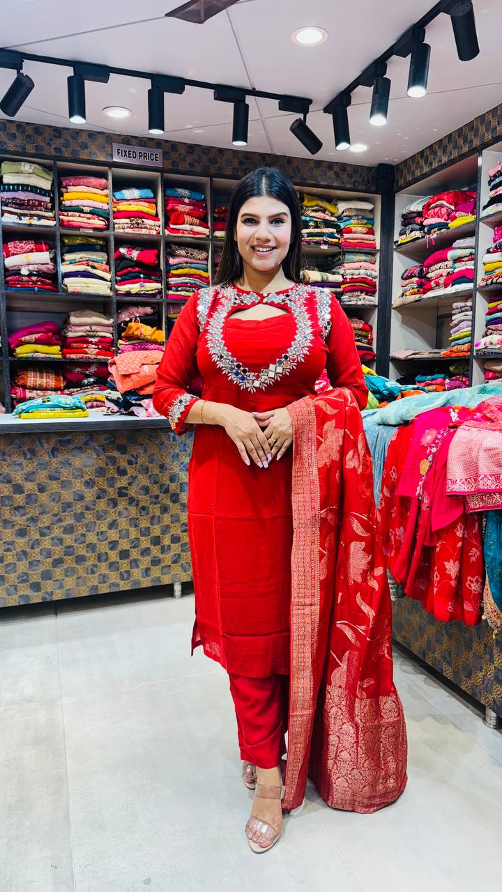 This stunning suit is crafted in premium Georgette fabric and radiates festive elegance with its rich crimson red tone. The neckline is beautifully adorned with intricate mirror work embroidery in silver and blue highlights, creating a striking centerpiece. The kurta features a modern keyhole neckline design, paired with plain straight pants for a sleek silhouette. Completing the look is a luxurious banarasi-style dupatta with golden floral weaving, adding traditional charm to this contemporary outfit. Perfect for festive gatherings, weddings, or special occasions.