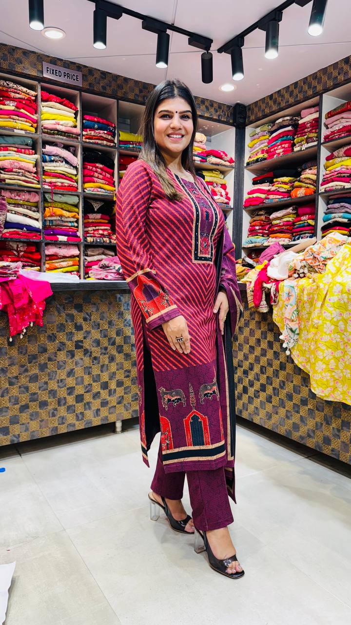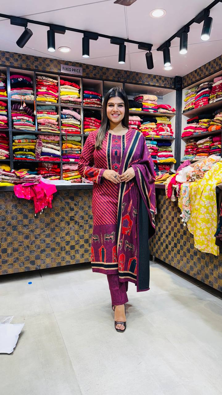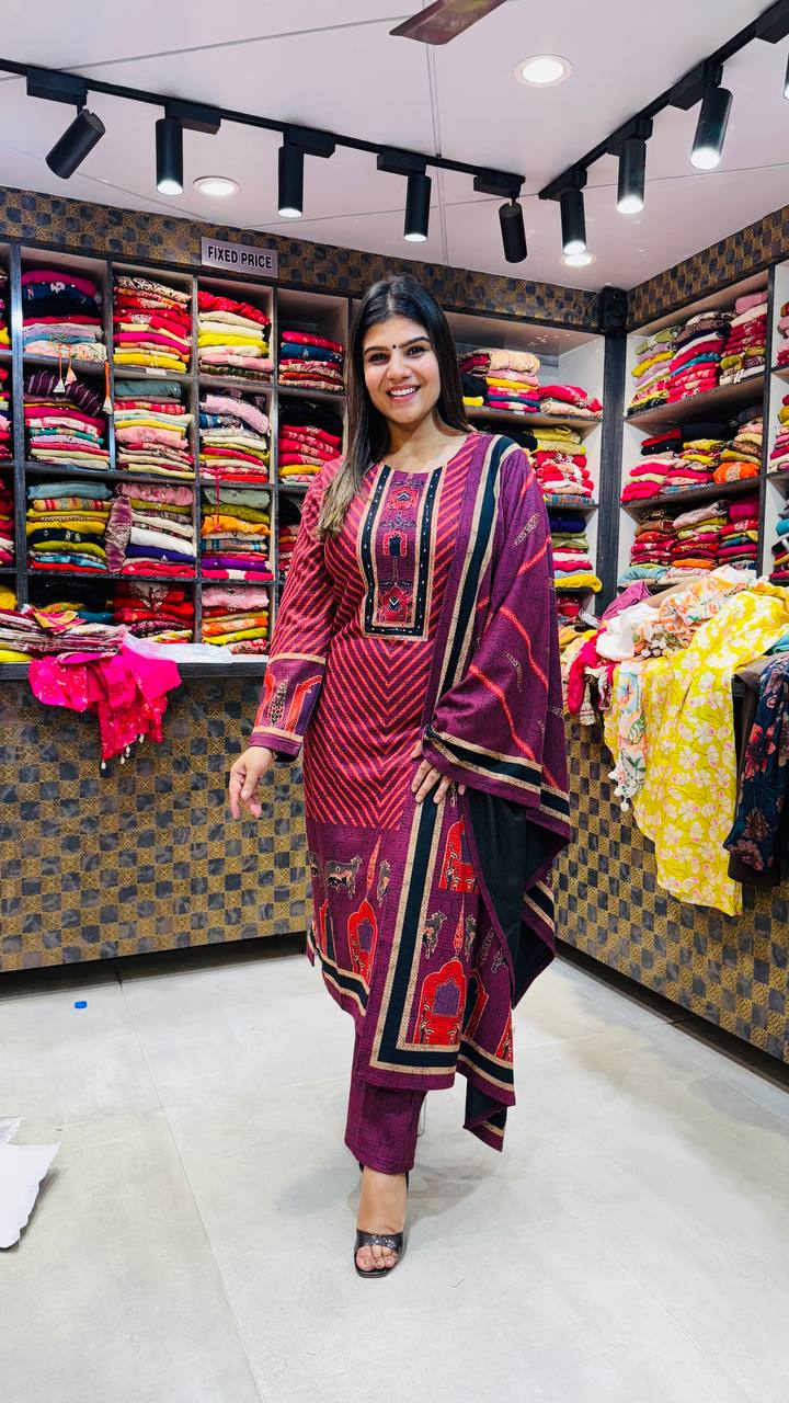 A premium soft & warm woolen 3-piece suit in a rich crimson wine / maroon base, enhanced with elegant ethnic architectural motifs and diagonal weave patterns. The kurta features detailed digital-inspired ethnic prints with hint of contrast elements, giving it a graceful yet contemporary festive look. The matching pant carries a subtle coordinated texture, while the dupatta completes the outfit with a beautiful bordered finish β perfect for winter wear, casual get-togethers and elegant day functions.