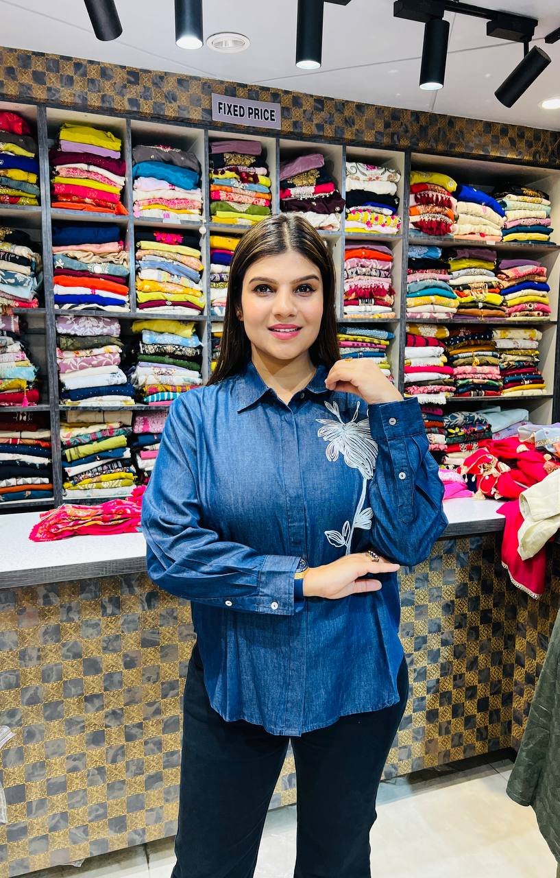 🎨 Colour: Denim Blue with White Floral Embroidery