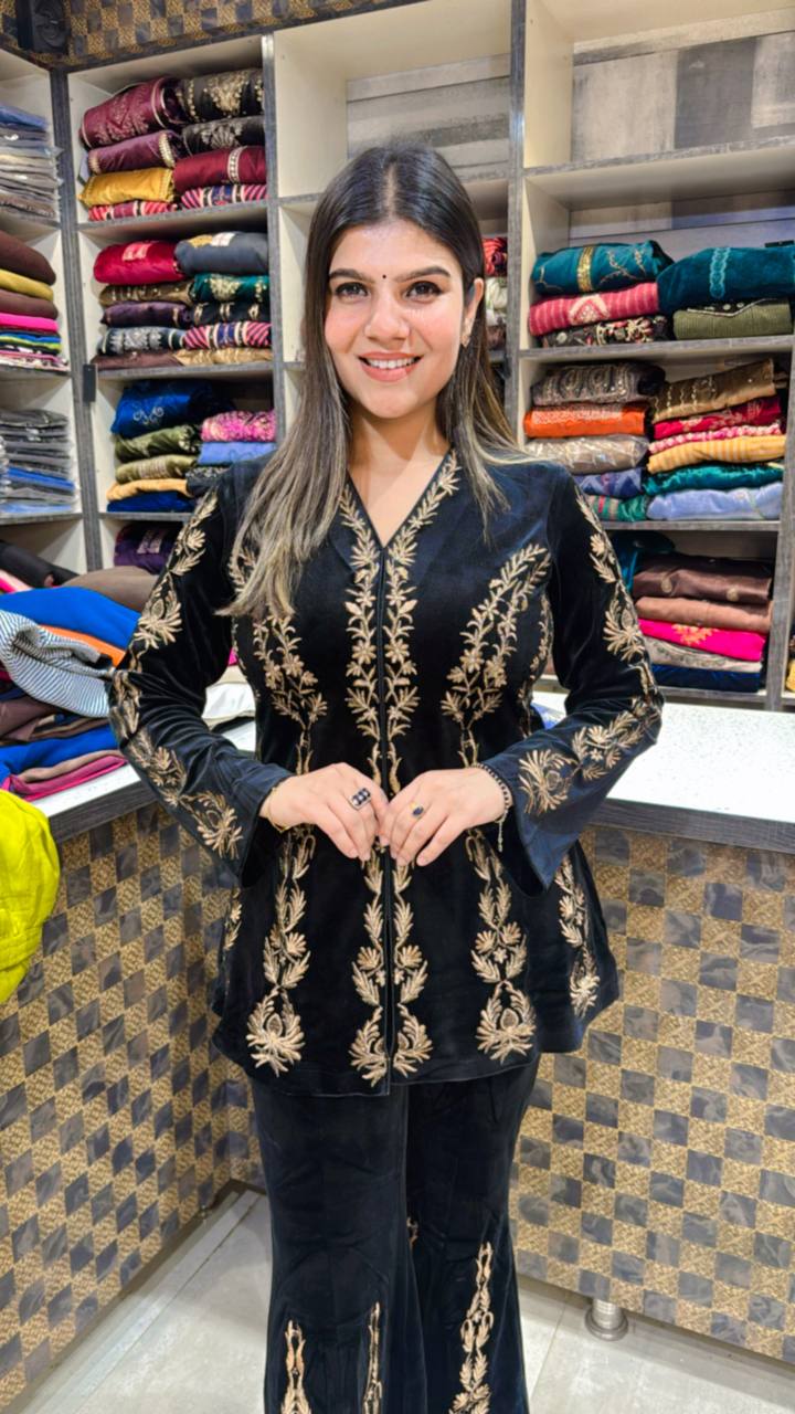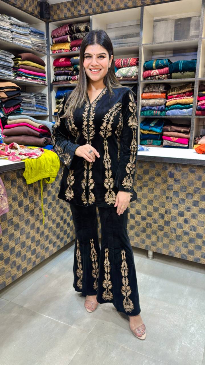 A premium deep ebony black velvet 2-piece suit crafted from imported soft velvet, adorned with antique golden thread embroidery. The kurti features elegant vertical motifs that give a taller & slimmer look, while the embroidered flare pant adds a rich and royal finish. Perfect for winter festivities, parties and premium occasions β stylish, warm and luxurious.