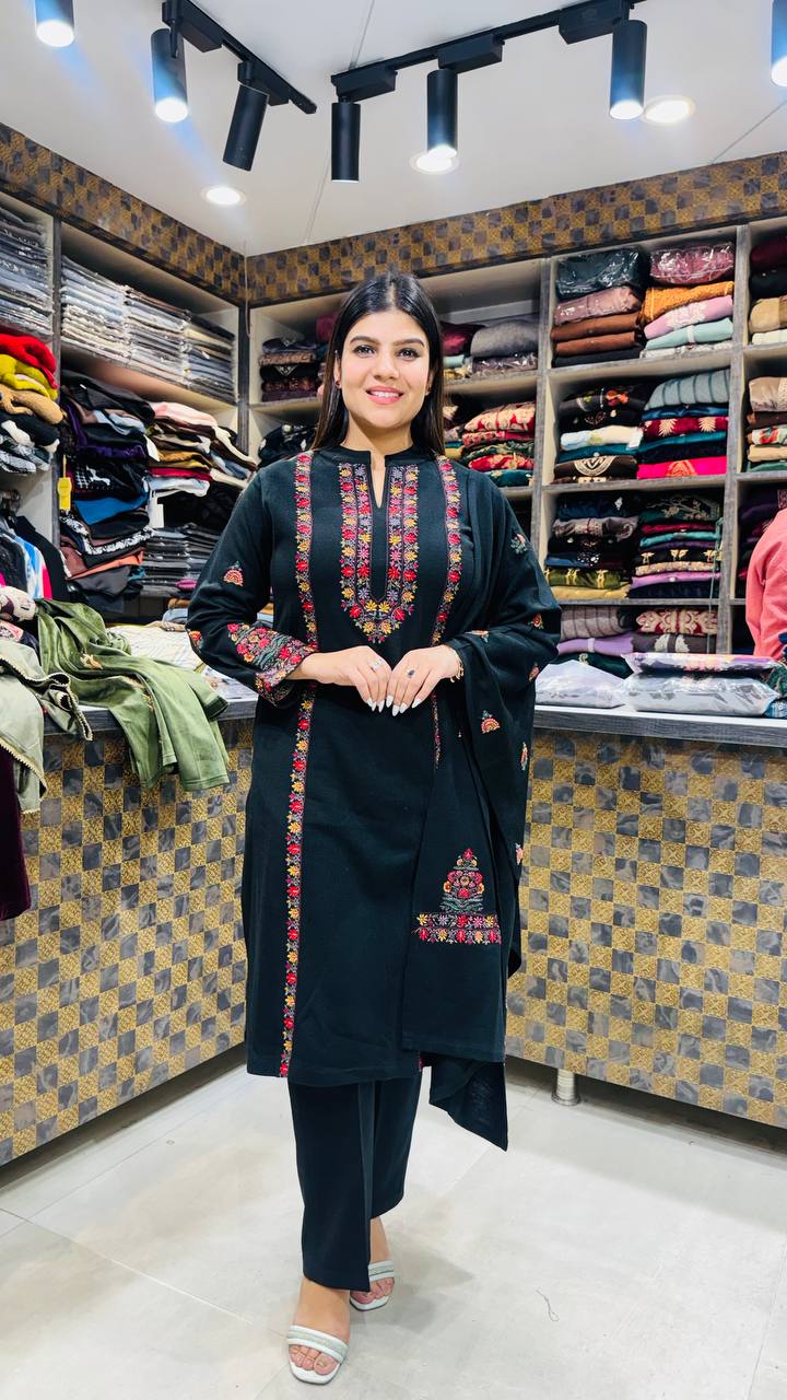 The matching dupatta carries coordinated embroidered motifs, adding harmony and detail to the entire outfit. Paired with straight black pants for a sleek and balanced look.