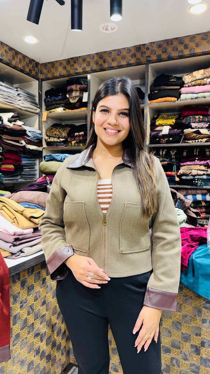 Elara is a Premium Korean Imported jacket-style shirt crafted in a soft olive-beige base with rich mocha-brown leatherette accents. The design features a sleek front zip closure, structured silhouette, and contrast detailing on the collar, cuffs, and pocket edges, giving it a refined yet modern winter look.
