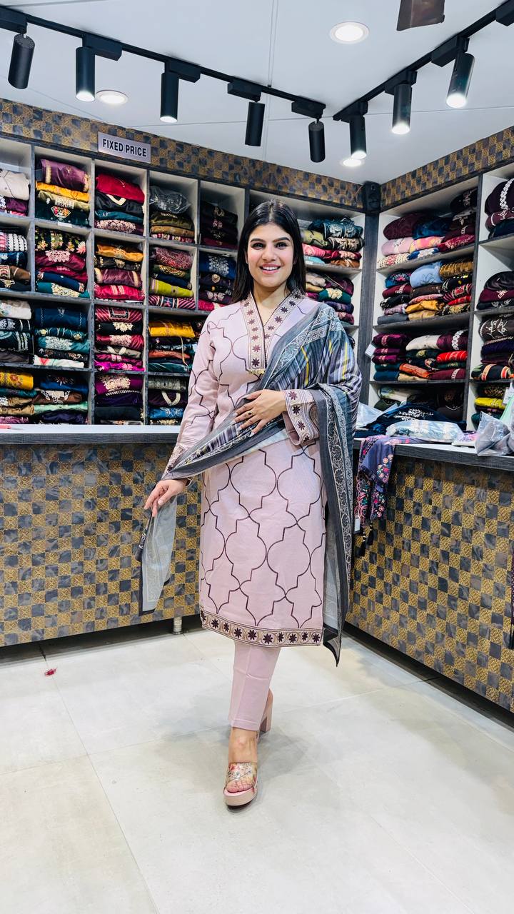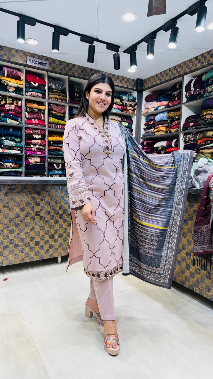 Elara is a graceful Powder Blush Premium Knitting 3-piece suit, designed for understated elegance. The shirt features a refined geometric lattice pattern in muted tones, accented with delicate embroidered details on the neckline, sleeves, and hem for a balanced, polished look.