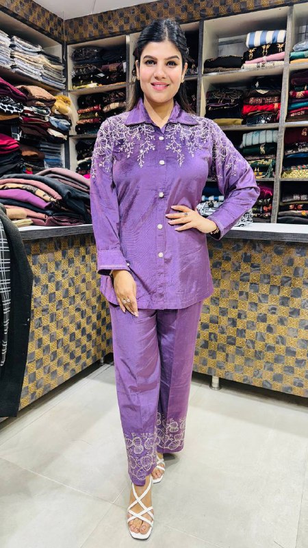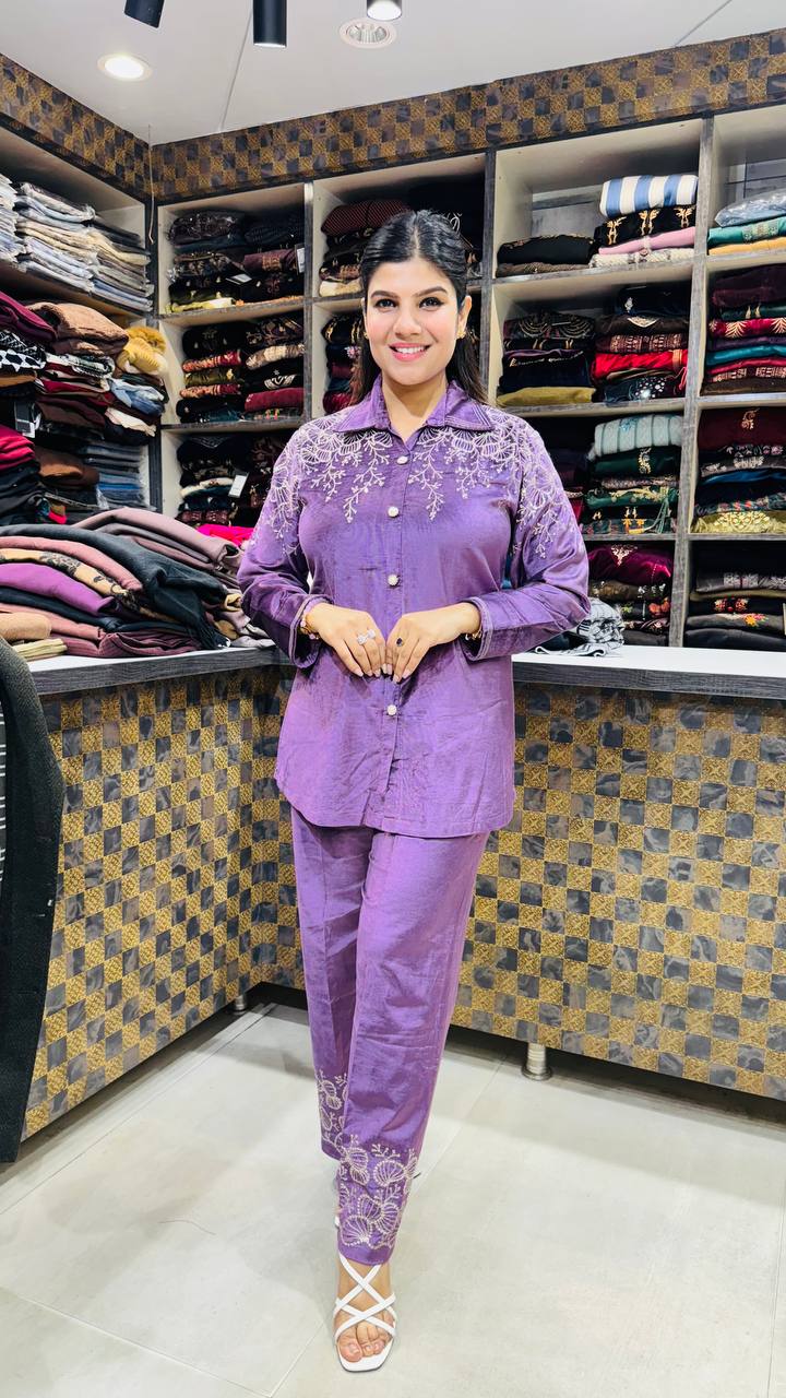 Elvaira is a refined 2-Piece Premium Cotrize ensemble in a muted royal lavender tone, crafted for understated luxury. The shirt features delicate ivory hand embroidery across the yoke and shoulders, flowing subtly into the sleeves for a soft, graceful finish.