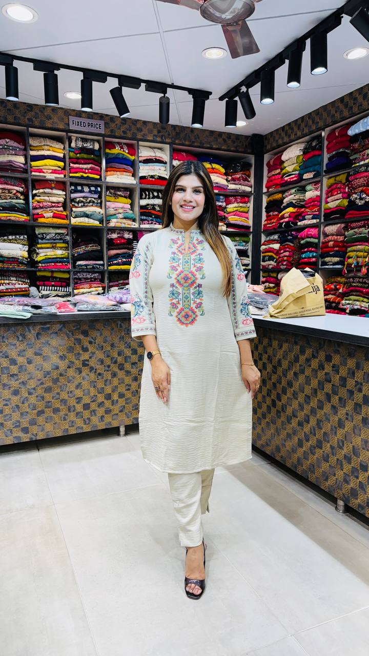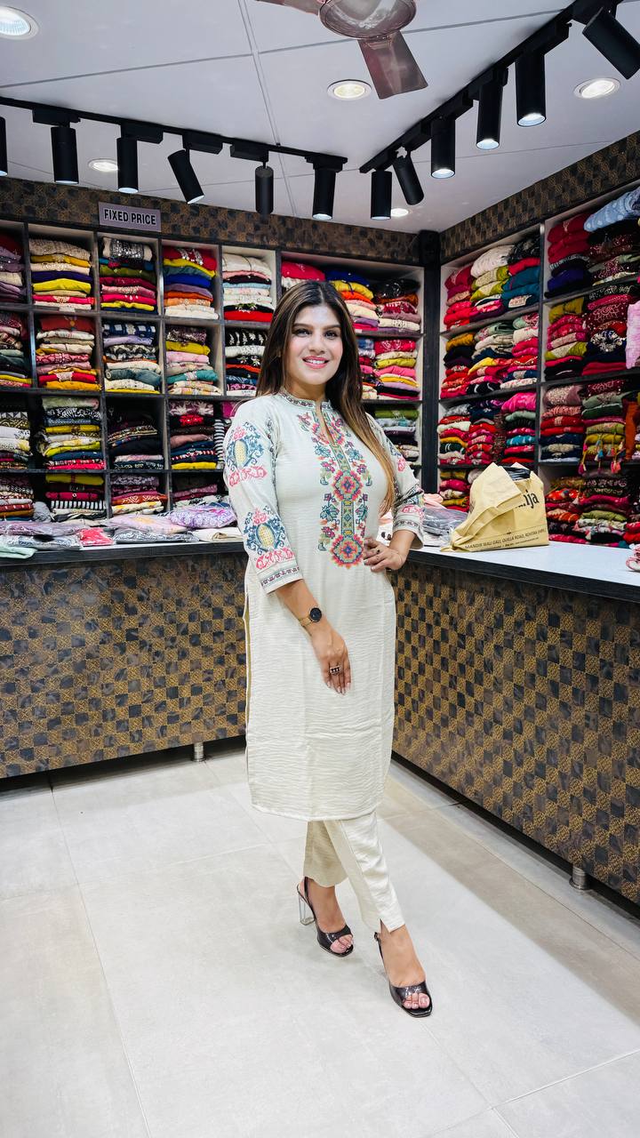 🧵 Design: Multicolor thread embroidery on neckline & sleeves