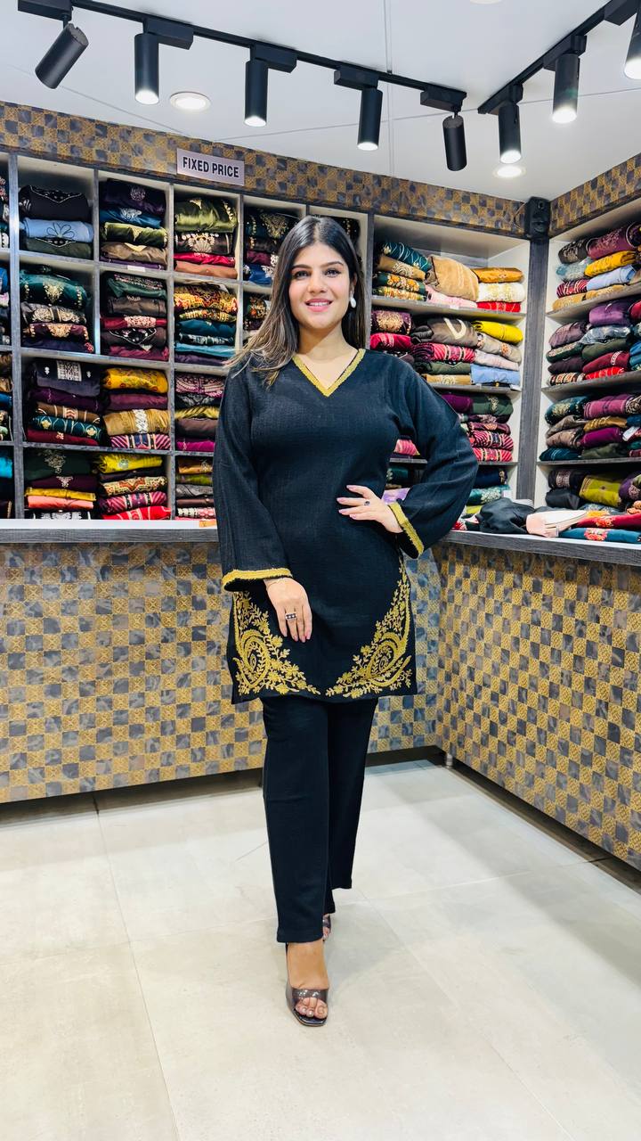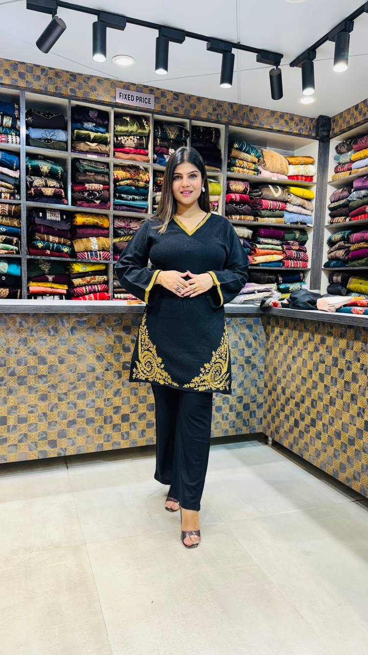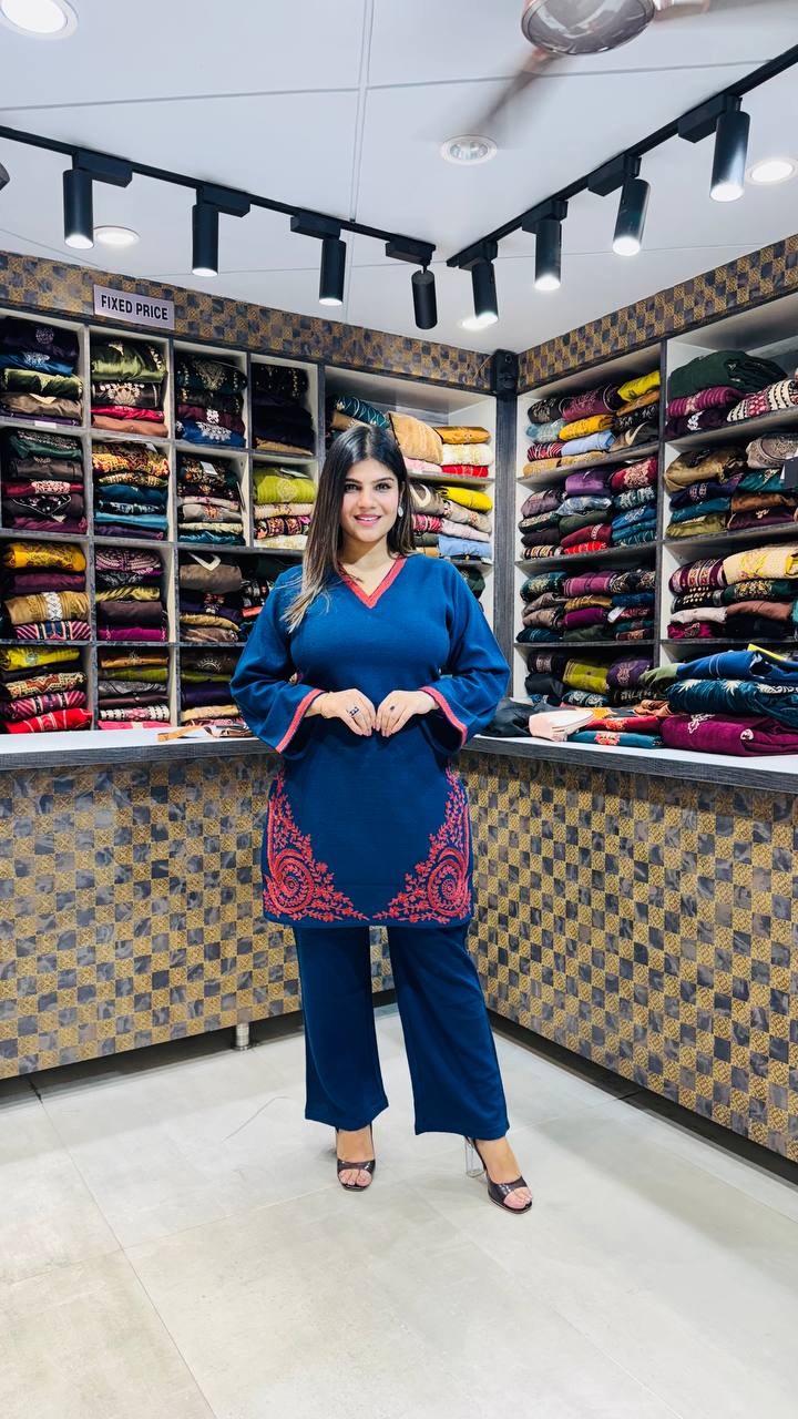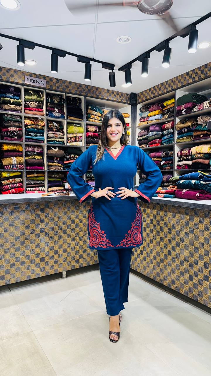 Make a statement this season with our Premium Knitted 2-Piece Sets, crafted for elegance, comfort, and warmth. Available in two stunning shades — Jet Black with Golden Embroidery and Royal Blue with Crimson Detailing — each ensemble showcases intricate thread work along the hem and sleeves, beautifully balancing traditional charm with a modern silhouette. The soft, stretchable knitting fabric ensures all-day coziness while maintaining a polished look. Perfect for casual get-togethers or festive evenings, Embellora captures the essence of winter sophistication.