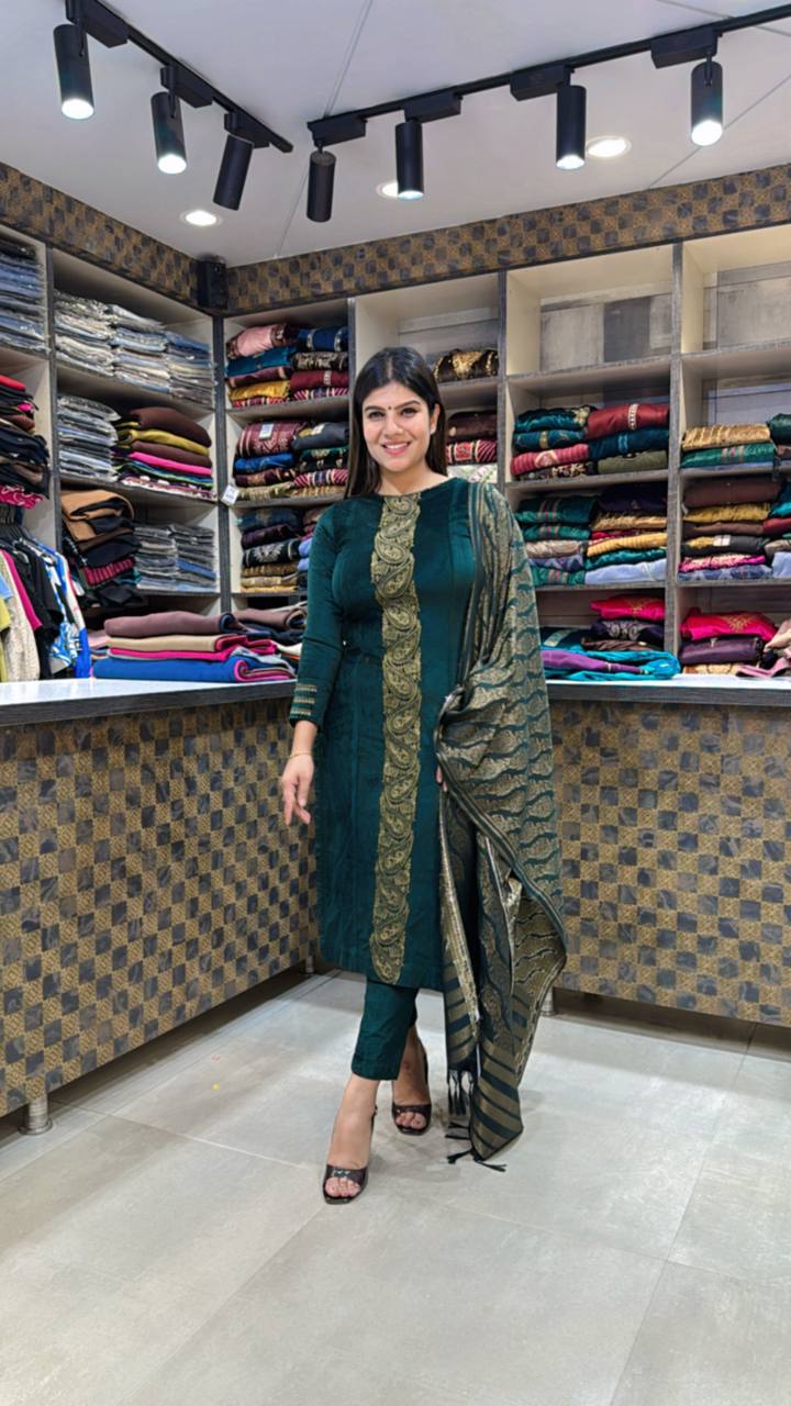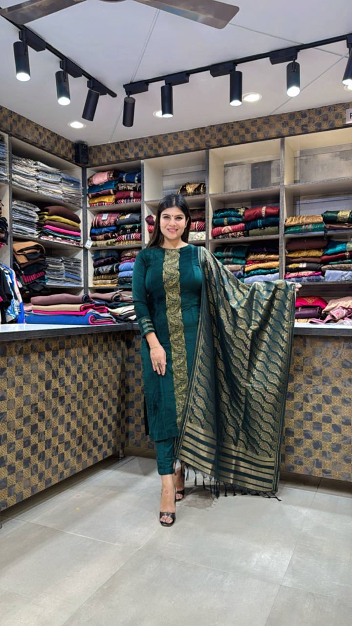 Drape yourself in rich sophistication with this emerald green premium cotrize 3-piece suit, crafted for timeless elegance. The kurta features a gold zari embroidered vertical panel, adding a regal touch to the deep hue. Paired with matching cotrize pants for a refined silhouette and a woven dupatta adorned with gold and green motifs with tassel edges, this ensemble exudes effortless luxury β perfect for festive gatherings and elegant evenings.