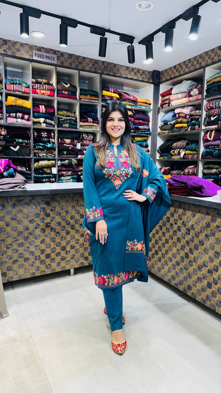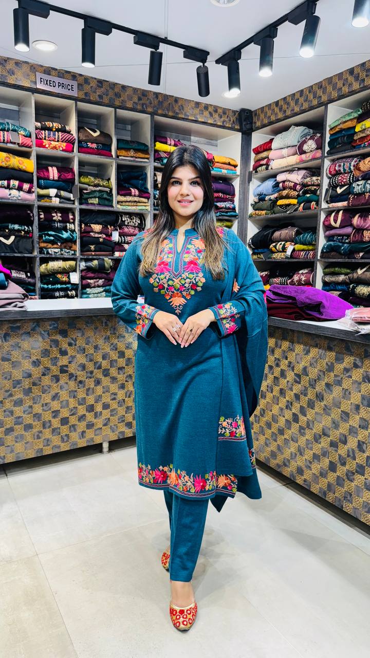 Firuzeh is a Premium Knitted 3-Piece suit crafted in a rich teal-blue tone that feels calm, elegant, and winter-ready. The soft knitted shirt features vibrant multicolour floral embroidery concentrated around the neckline, sleeves, and hem, adding warmth and visual depth without overpowering the base colour.