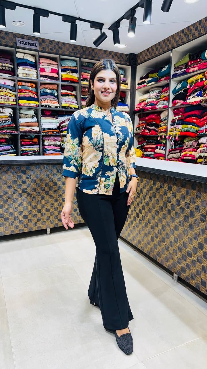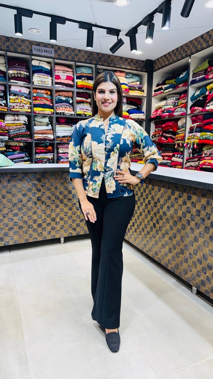 ✨ Design: Large Floral Print • Mandarin Collar • Front Button Detailing • Structured 3/4 Sleeves (only Top)