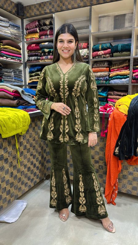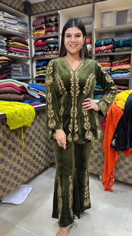 “Forest Muse” captures the charm of nature with its lush olive green hue on imported velvet fabric, adorned with golden floral embroidery on the neckline, sleeves, and pant borders. The luxurious sheen of velvet and elegant embroidery create a statement look perfect for winter festivities and evening celebrations. Designed to exude sophistication and grace, this 2-piece set is timelessly elegant.