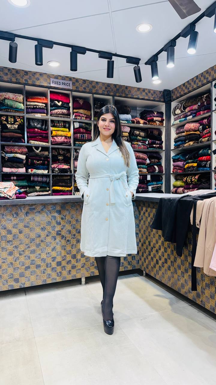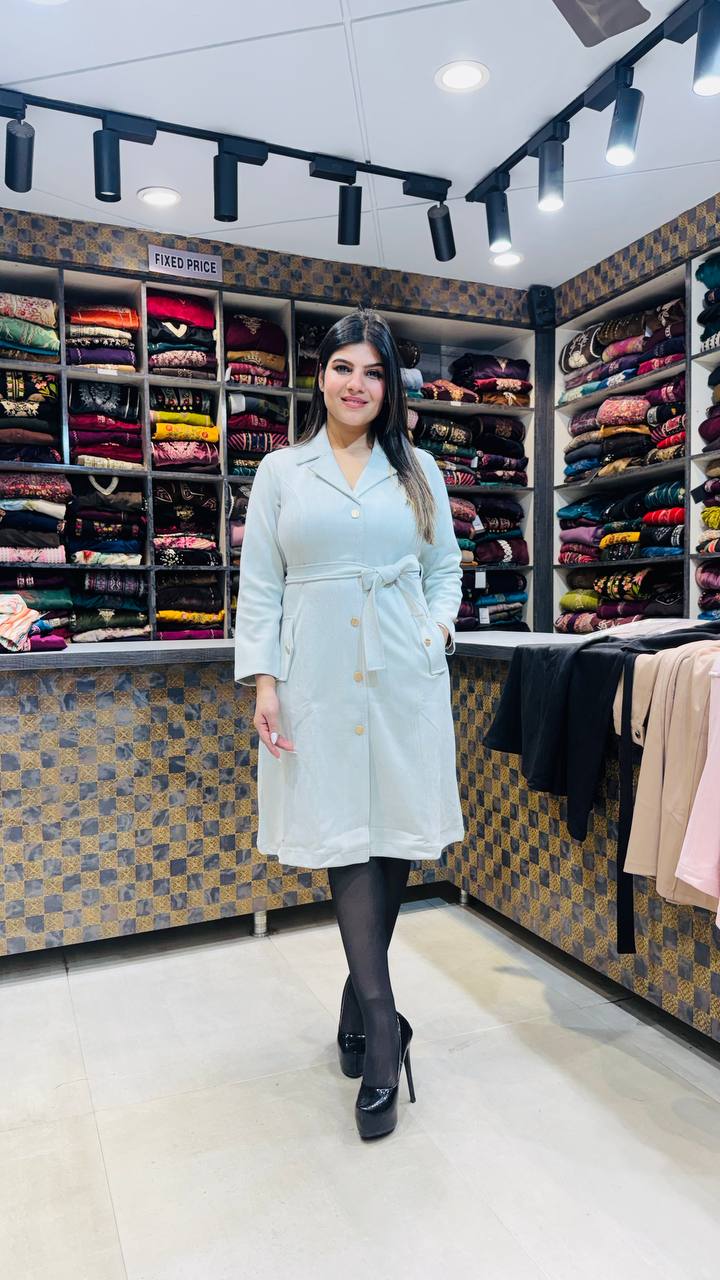A soft frost mint winter trench crafted from premium imported fabric, offering a refined, cozy, and elegant seasonal look. Designed with a classic lapel collar, gold button detailing, and a self-tie waist belt that creates a beautifully structured silhouette. Side pockets add both style and comfort, making it ideal for winter outings, office wear, and chic everyday layering.