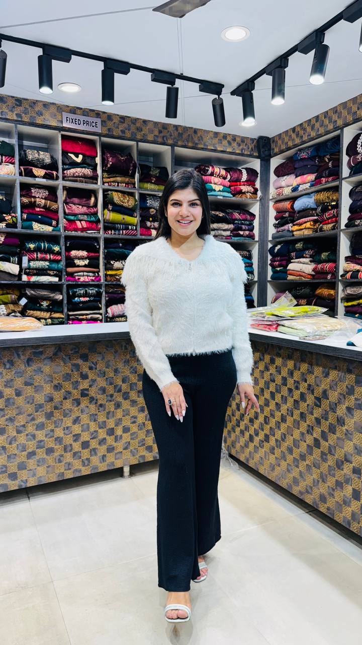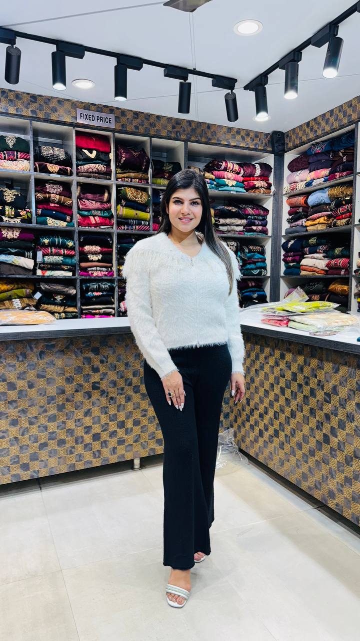 Frostelle is a Pure Winter Woolen Top in a Soft Snow-White shade, crafted from premium fluffy woolen fabric for a warm and ultra-cozy feel. The top features a feather-textured upper panel, full sleeves, and a clean zip-front closure, giving it a chic and modern winter look. Perfect for styling with trousers, jeans, or skirts for a classy cold-season outfit.