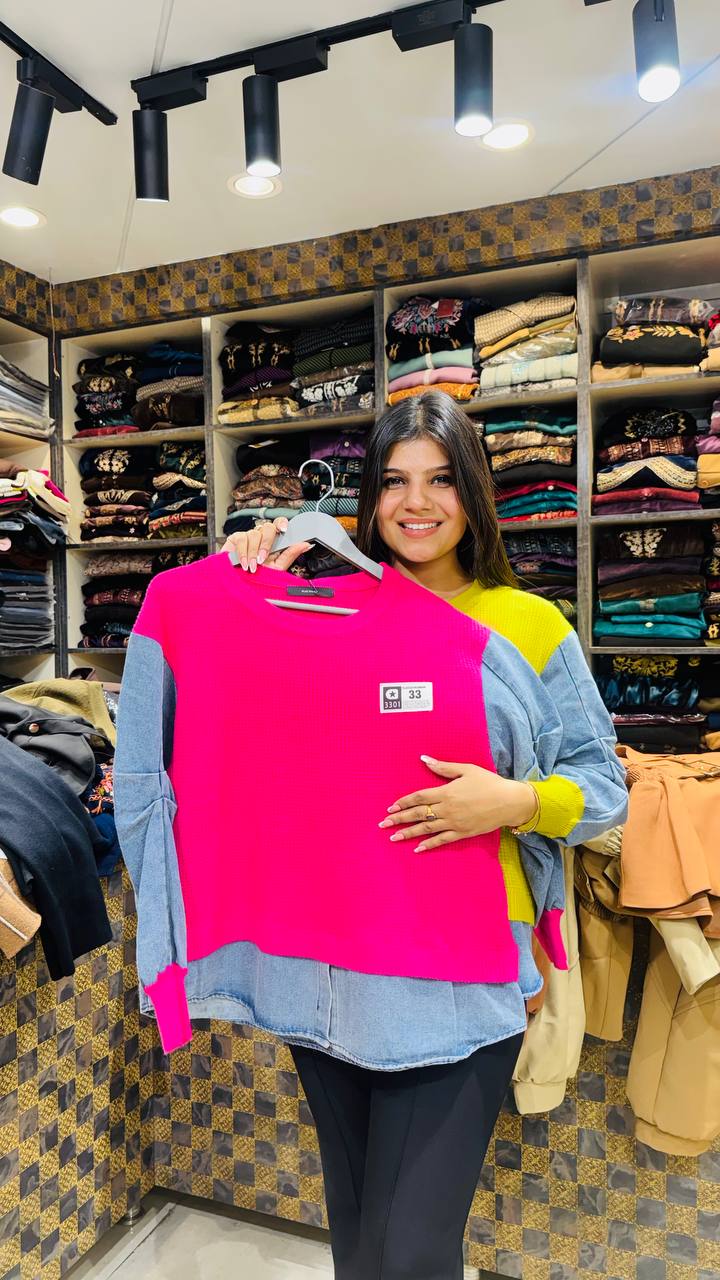 Fuchsia is a Premium Warm imported top designed to stand out without trying too hard. The bold hot-pink body instantly draws attention, while the soft washed denim-blue sleeves and hem create a striking colour-block contrast.
