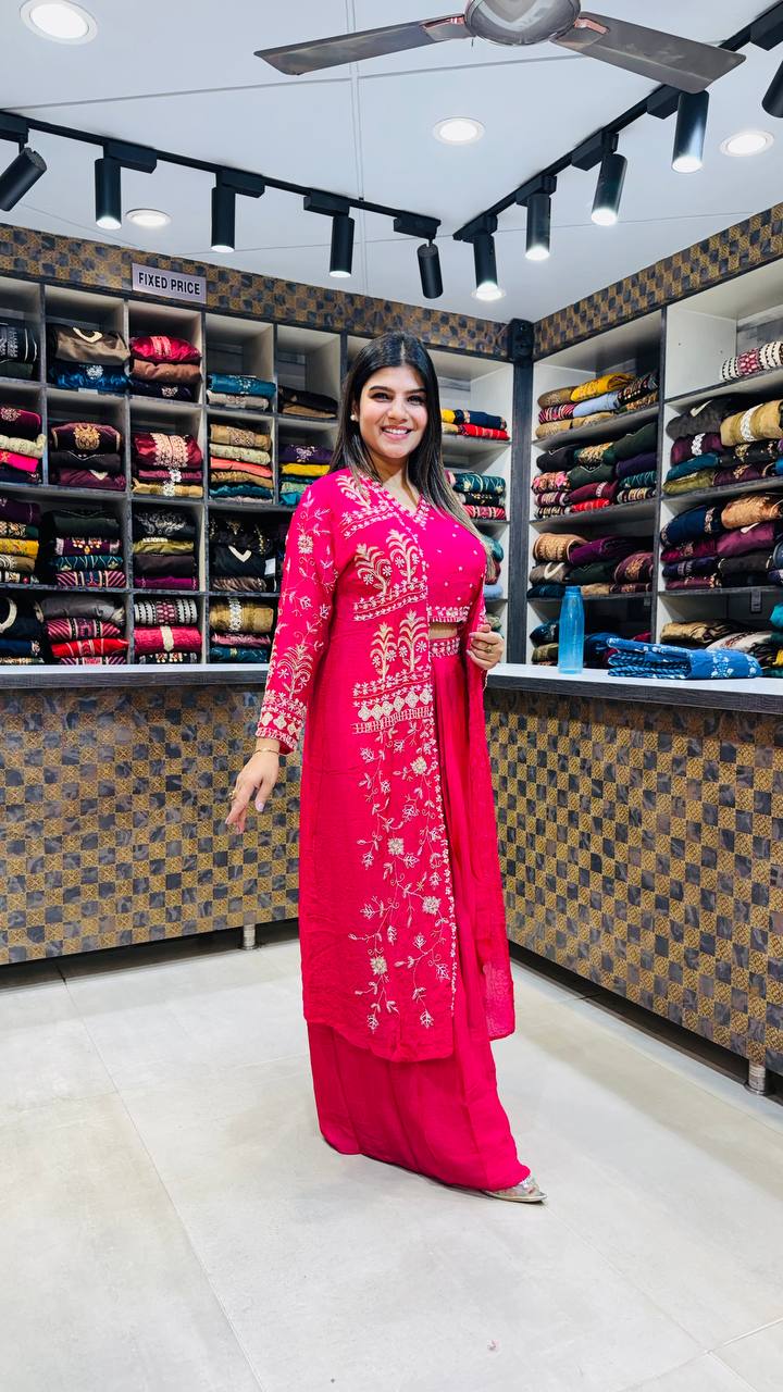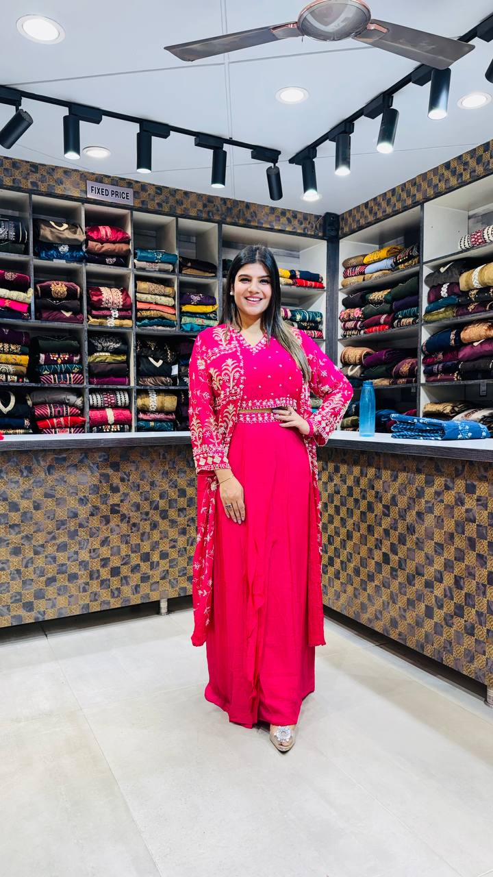 A radiant ensemble in premium chinon fabric, this 3-piece set brings festive glamour to life. The outfit features a vibrant fuchsia pink choli and flared skirt, paired with a beautifully embroidered shrug in matching tone adorned with gold zari and sequin motifs. The fluid drape of chinon enhances its royal grace, making it perfect for weddings, festive celebrations, or evening events.