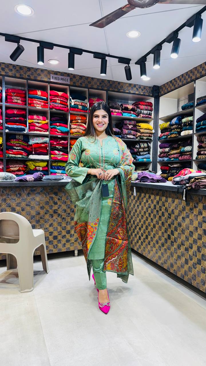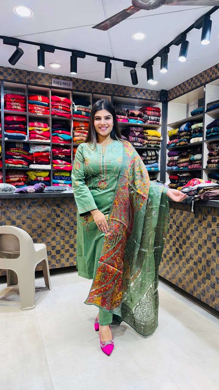 Step into timeless elegance with our Premium Cotrize 3-Piece Suit in a radiant golden mustard hue. Crafted from luxuriously soft velvety cotrize, this ensemble features a finely embroidered kurta paired with tailored pants for a graceful silhouette. The look is elevated with a deep green dupatta adorned in intricate golden motifs β adding depth and royal charm. Ideal for festive occasions or elegant gatherings, this outfit captures warmth, luxury, and classic sophistication in every detail.