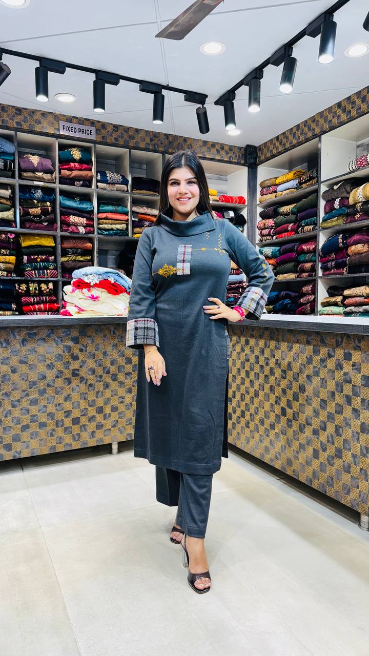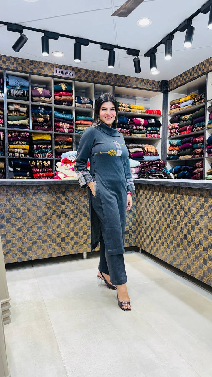 A charcoal grey knitted co-ord crafted for warmth and modern style. The kurta features chic plaid patchwork with subtle mustard floral embroidery, adding a refined touch to its minimalist silhouette. Soft, cozy, and effortlessly stylish—perfect for winter outings and everyday elegance.