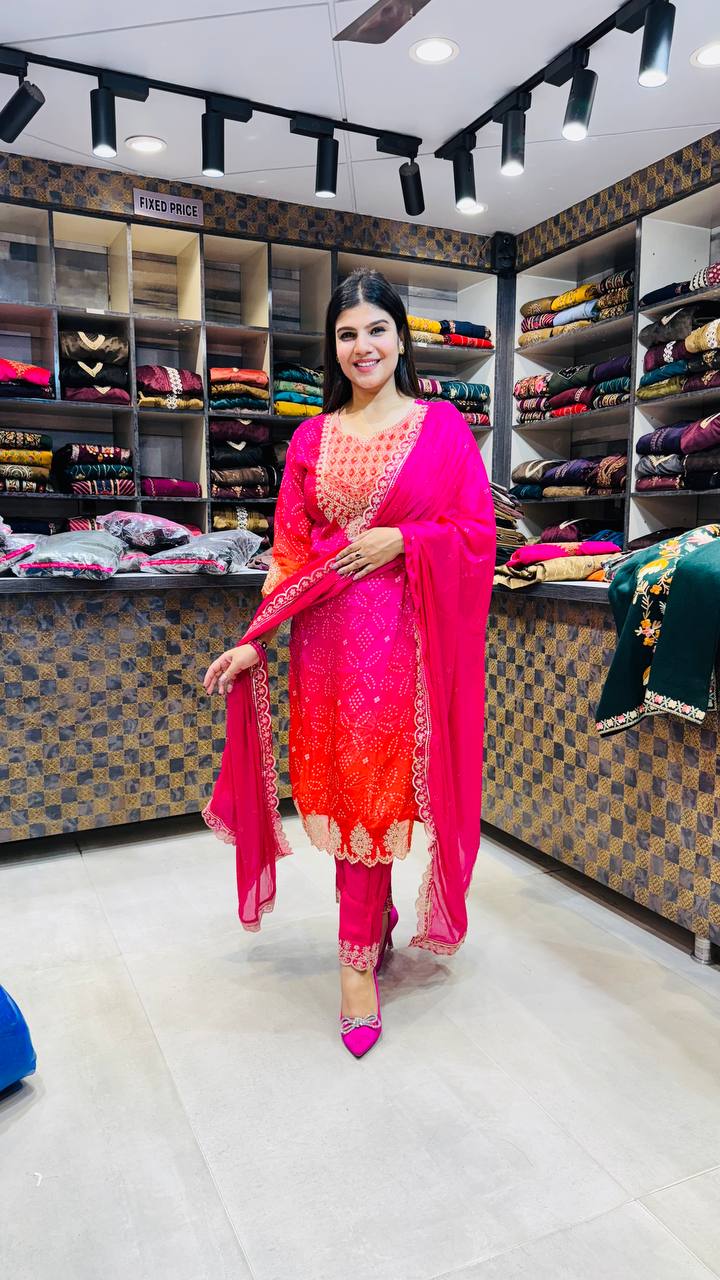 A vibrant Chinon 3-piece suit that beautifully blends fuchsia pink and sunset orange hues, creating a radiant ombré effect. The kurta is adorned with intricate embroidery and mirror work, adding a festive sparkle to the rich colour palette. Paired with a matching embroidered pant and a flowy Chinon dupatta finished with lace borders, this outfit embodies grace, glamour, and celebration — perfect for weddings, sangeet nights, or festive gatherings.