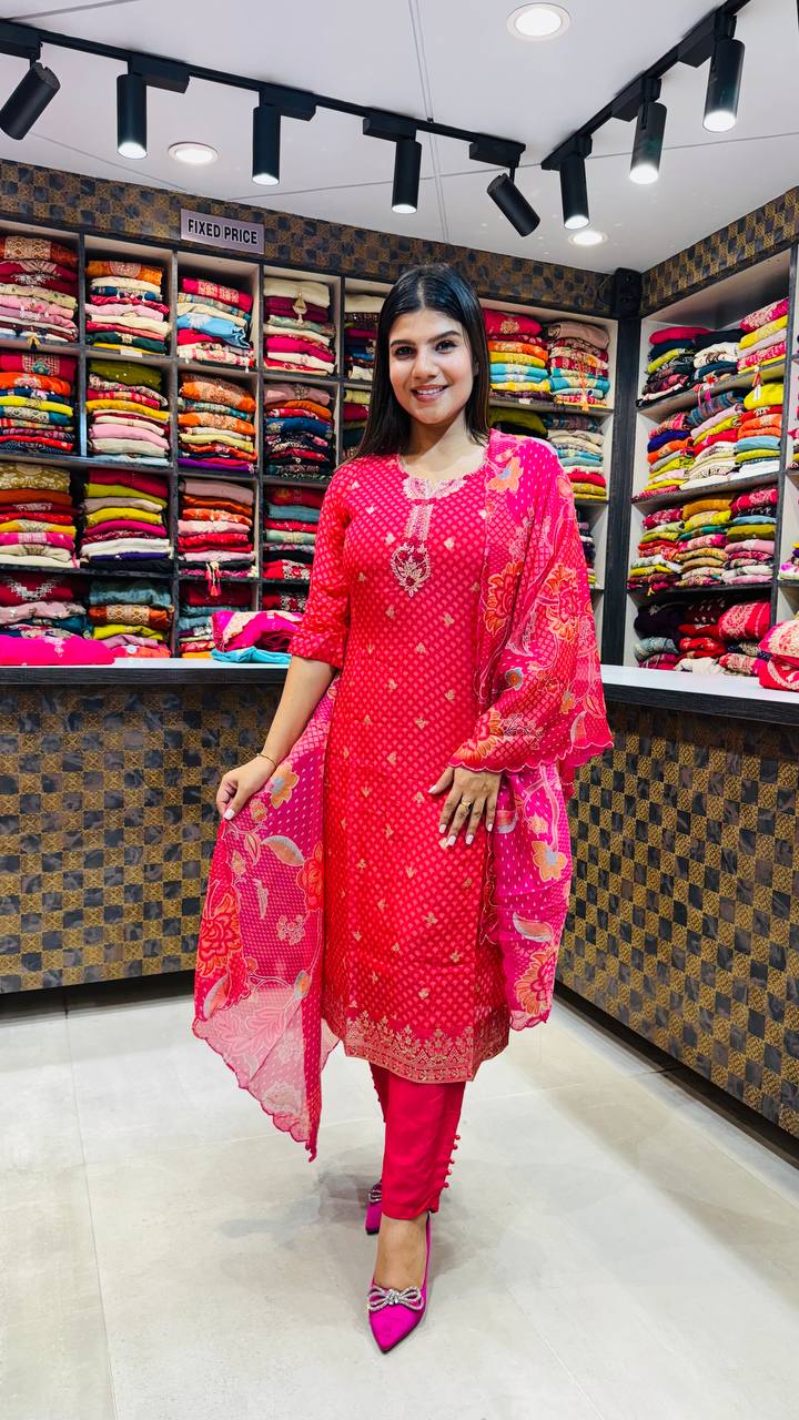 A mesmerizing fuchsia pink organza suit set that beautifully blends traditional charm with modern grace. The kurta features delicate white embroidery and a subtle bandhani-inspired pattern, giving it a refined festive touch. Paired with a vibrant printed dupatta and solid pants, this outfit radiates elegance and freshness β perfect for daytime celebrations or festive gatherings.