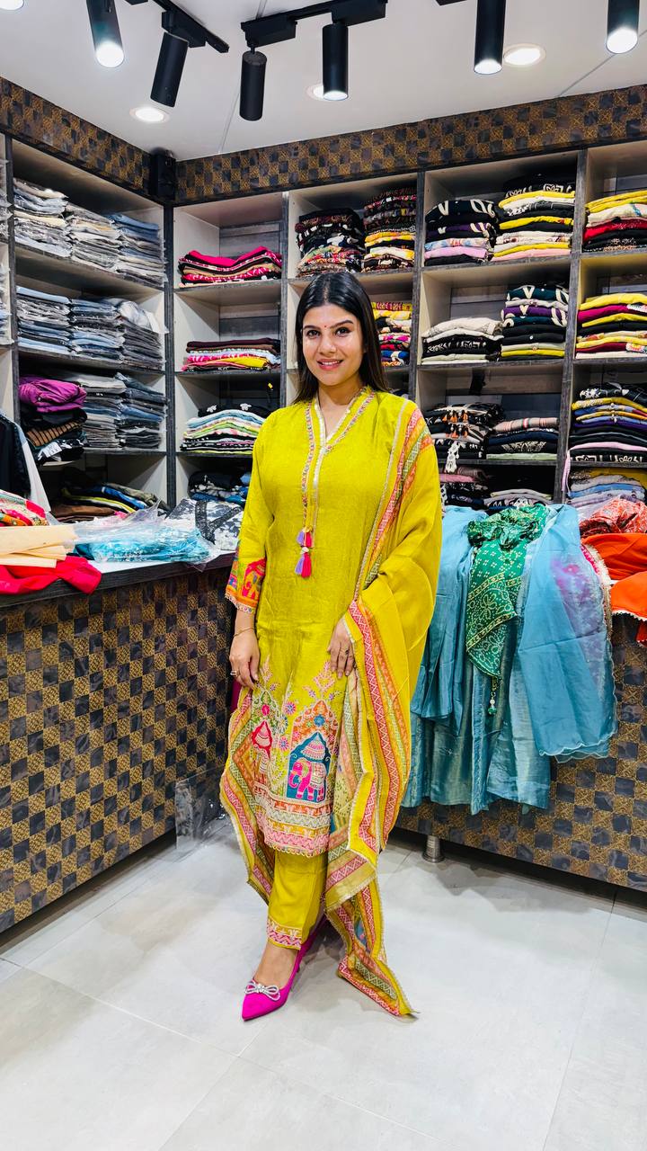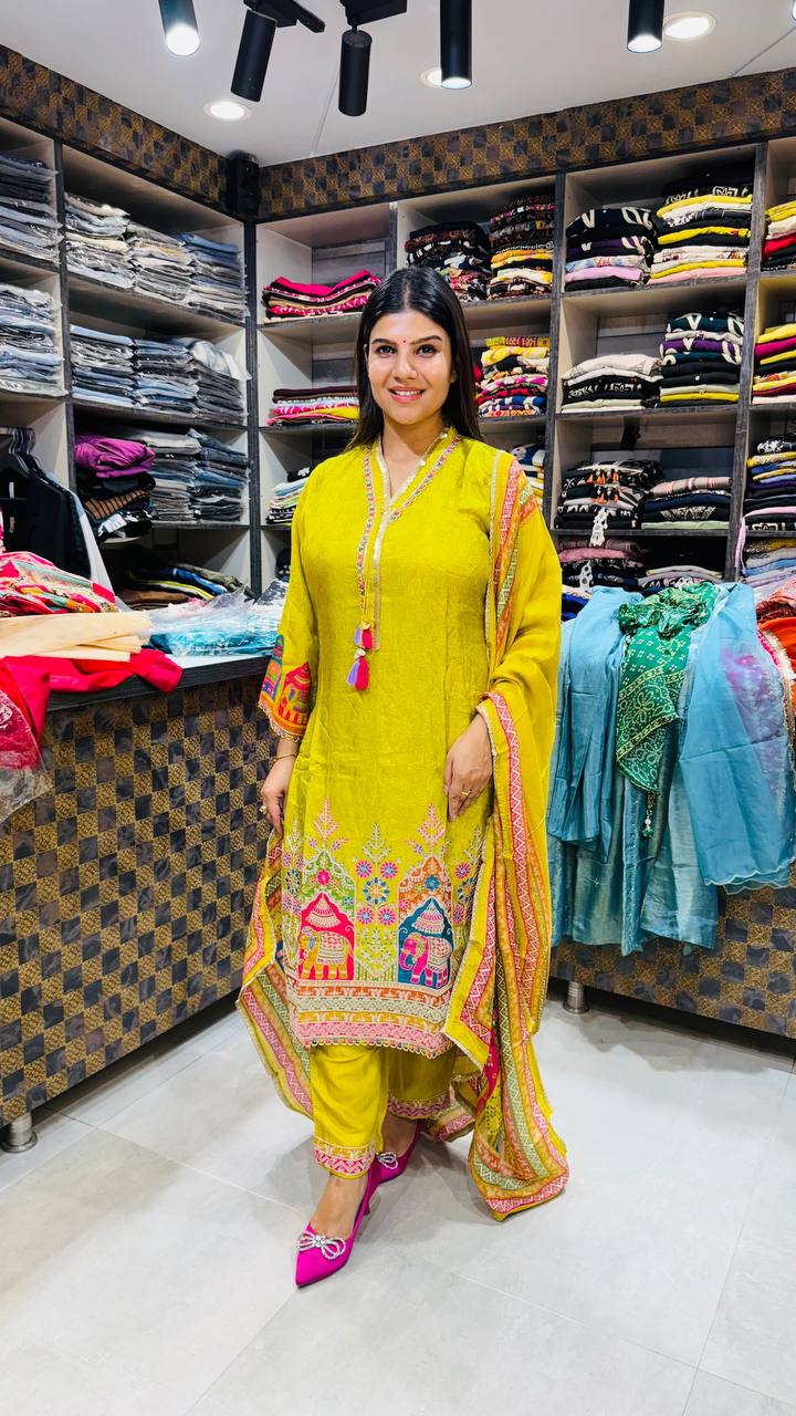 A regal mustard yellow silk suit set that celebrates traditional artistry with a touch of royalty. The straight kurta features vibrant embroidered elephant motifs along the hem, detailed with mirror accents and colorful threadwork that bring the design to life. The neckline is adorned with tassel ties and intricate borders, perfectly complemented by the coordinated printed dupatta and plain silk pants with embroidered edges. Ideal for festive gatherings and cultural celebrations, this outfit radiates joyful elegance.
