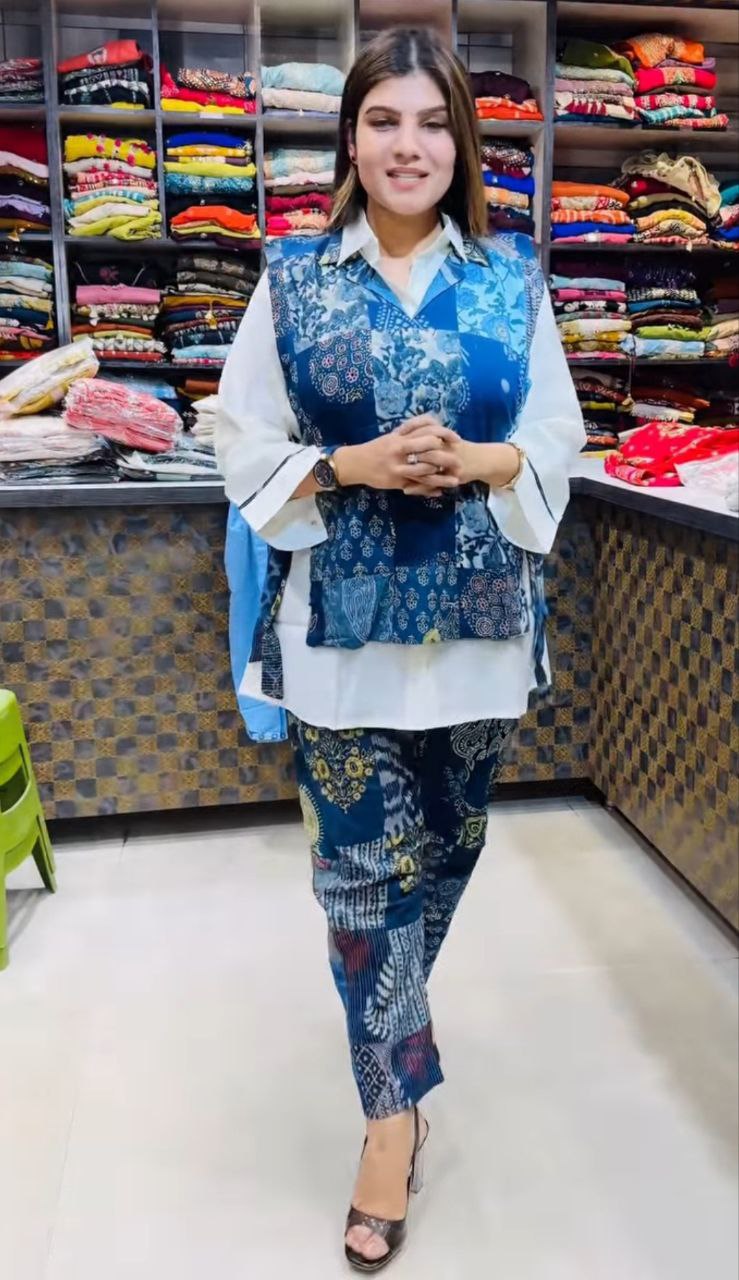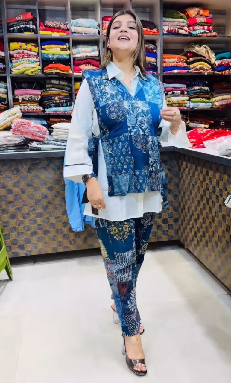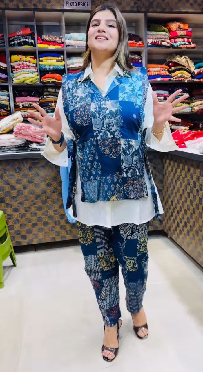 A contemporary fusion set crafted in premium cotton, designed in rich shades of indigo and deep blue. The outfit features a layered silhouette with a crisp off-white inner shirt paired with a printed blue overlay top. The overlay showcases a patchwork-inspired mix of floral and traditional motifs, creating a modern artistic appeal. The matching printed straight pants carry coordinated ethnic patterns, balancing the layered look beautifully. Perfect for casual outings, smart day wear, and statement everyday styling.