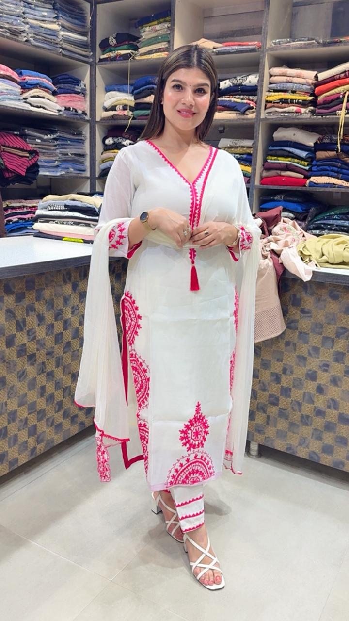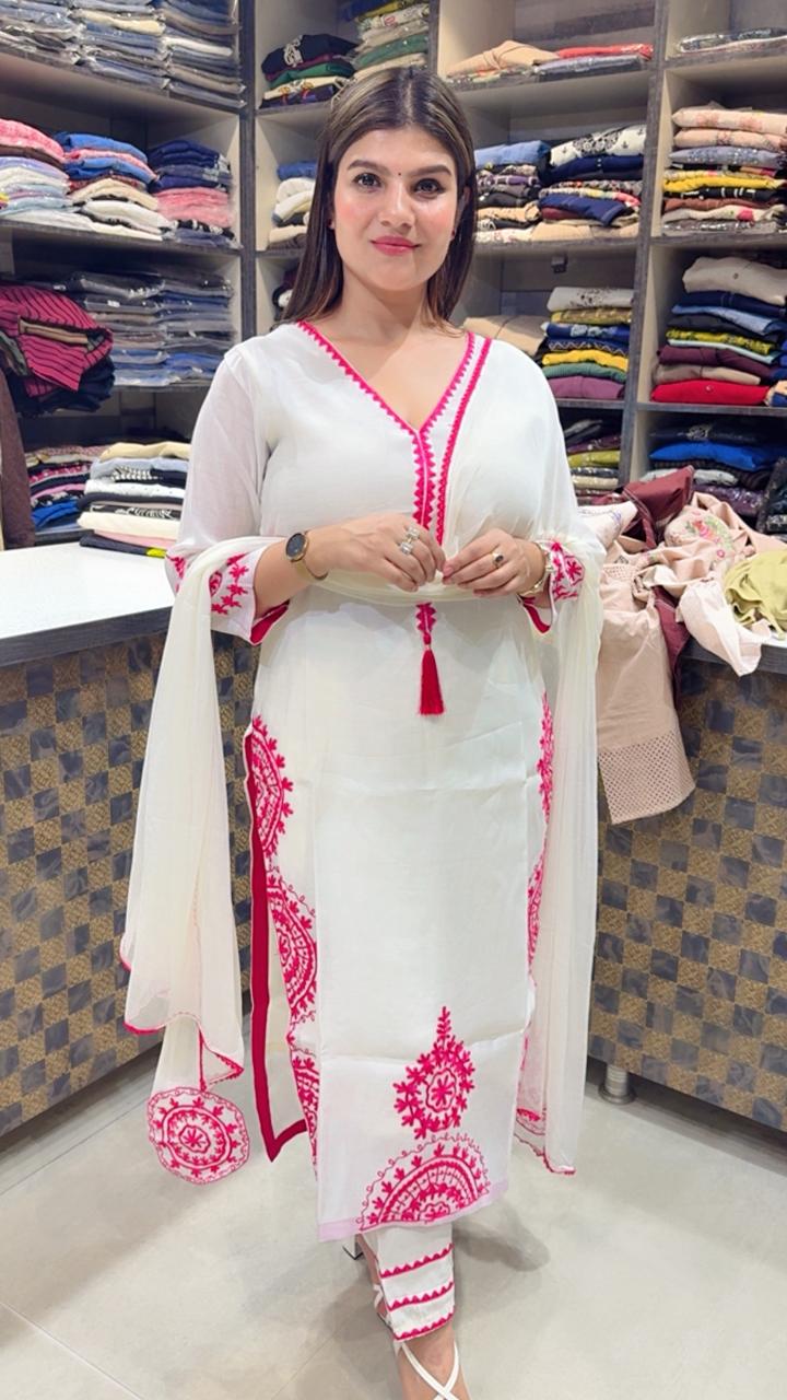A graceful ivory white suit crafted in premium organza with cotton lining attached, offering a light and elegant feel with comfortable wear. The outfit features beautiful contrast embroidery in vibrant pink, forming intricate traditional motifs along the front and hemline. The V-neckline with tassel detailing and embroidered sleeves adds a delicate charm, while the soft flowing dupatta completes the refined look. Perfect for festive gatherings, daytime celebrations, or elegant casual occasions.