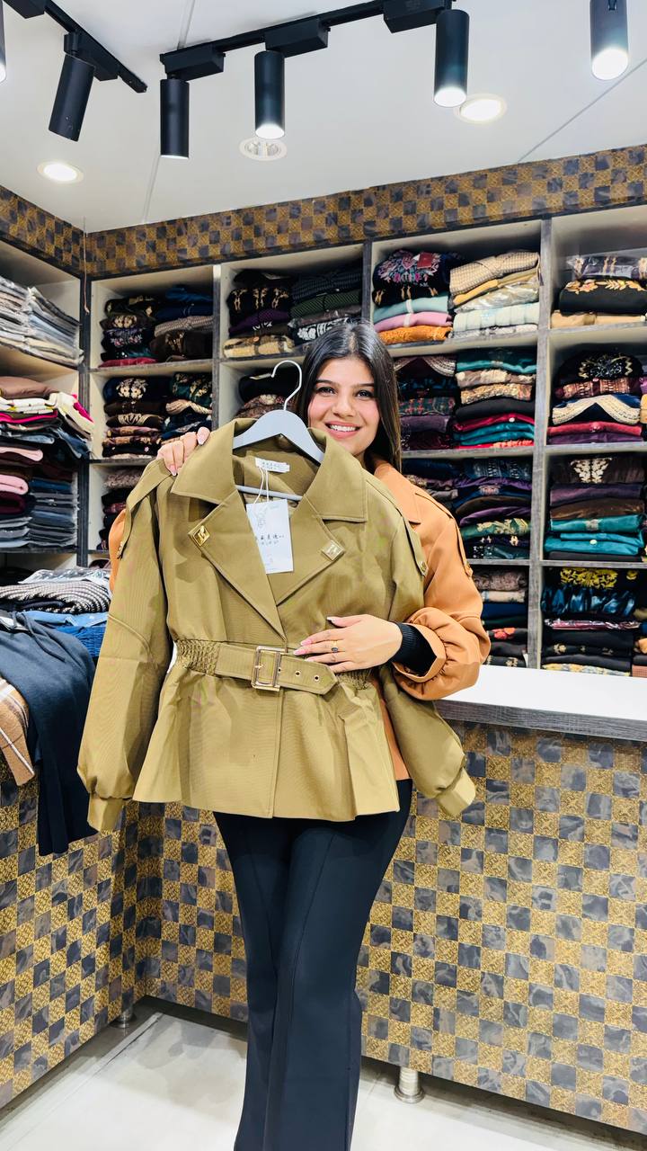 Khakière is a Premium Imported Warm Blazer crafted in a rich khaki-beige tone with a sharp, tailored silhouette. The design features a classic notched lapel, statement front buttons, and a cinched waist enhanced by a matching belt that adds structure and definition.