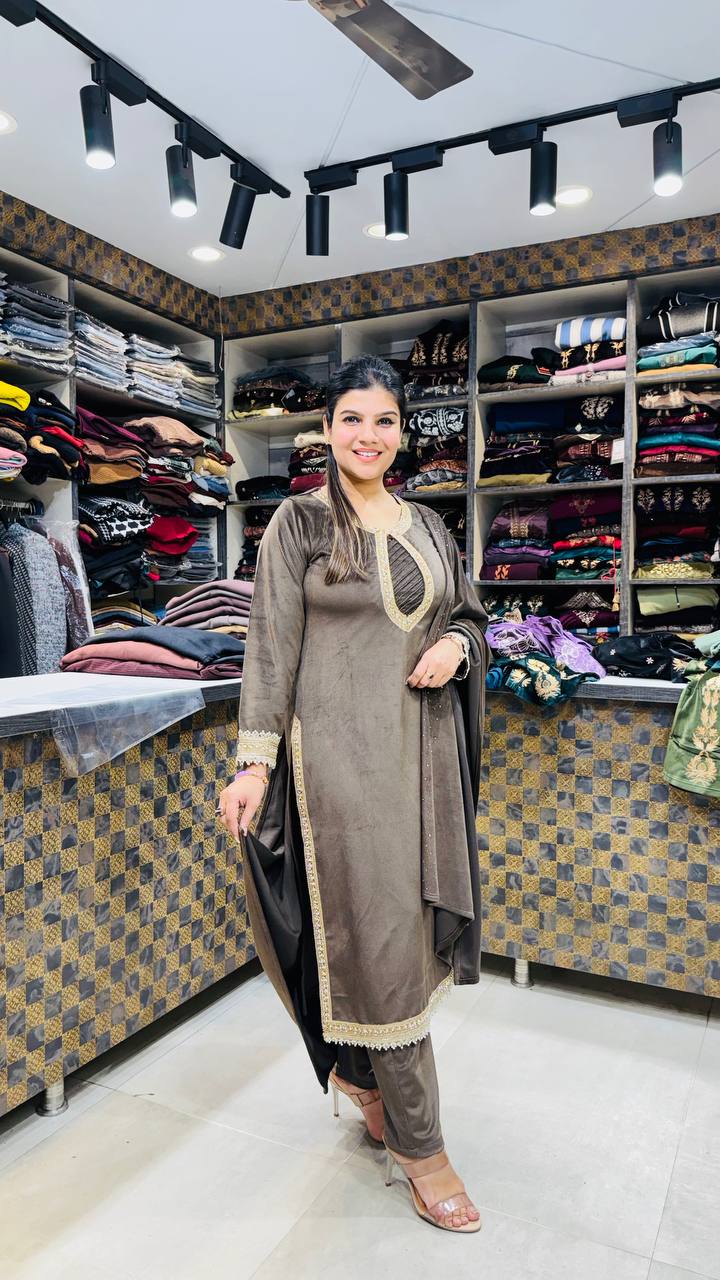The rich velvet fabric gives a smooth, warm drape, while the minimal borders on sleeves and hem keep the design composed and elegant. Paired with straight velvet pants and a soft matching dupatta, this set is built for winter evenings, formal gatherings, and understated luxury wear.