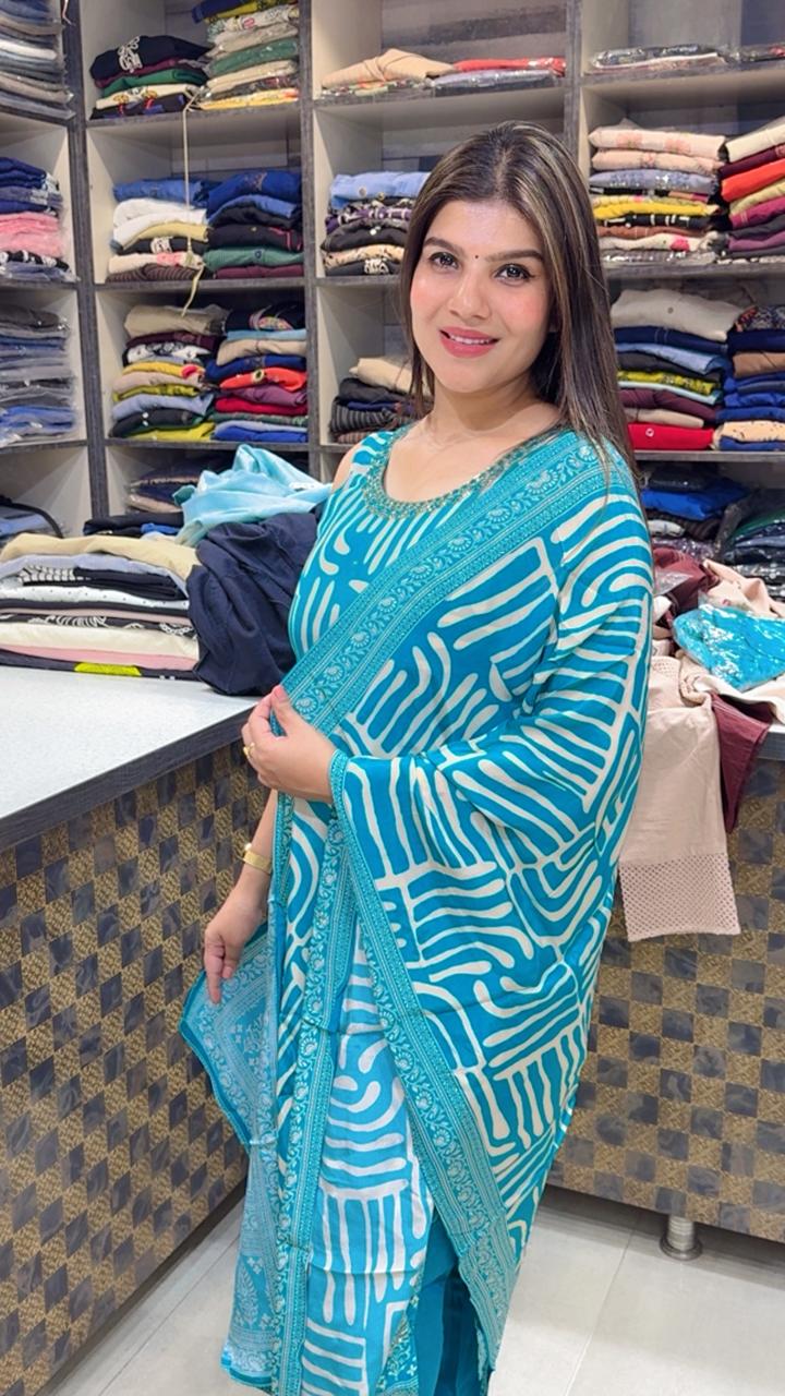A refreshing turquoise blue suit crafted from premium crepe fabric, offering a smooth texture and elegant drape. The outfit features a bold abstract white pattern that gives it a modern and stylish look. The round neckline is delicately embellished, while the printed dupatta with detailed borders enhances the overall charm. Paired with matching pants, this outfit is perfect for casual gatherings, daytime outings, and effortless everyday style. Sleeves are available for those who prefer added coverage.