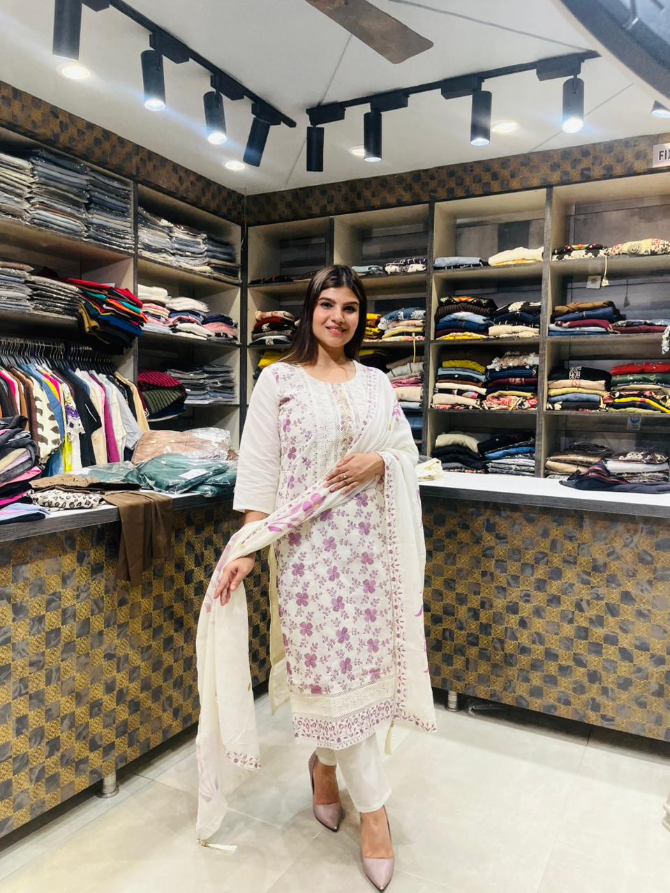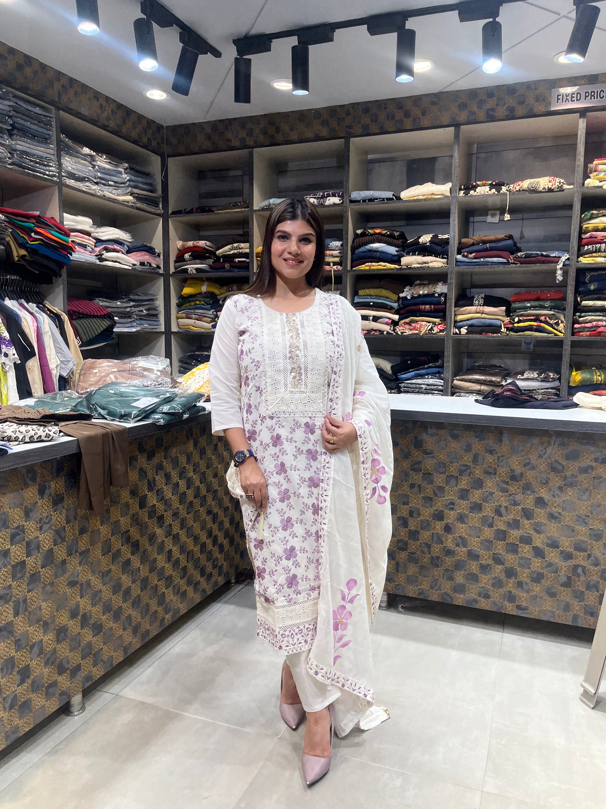 Liloura is a graceful Premium Schiffli 3-piece suit crafted in a soft Ivory base, beautifully enhanced with delicate Lavender floral motifs. The kurti features elegant Schiffli embroidery work on the front panel, creating a refined textured look that adds depth and sophistication to the design.