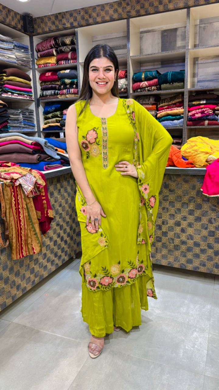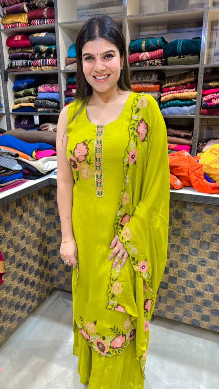 Step into elegance with this refreshing lime green ensemble, beautifully crafted from premium Chinon fabric known for its graceful fall and subtle sheen. The sleeveless kurta features delicate thread and floral embroidery along the neckline, hem, and sides, adding a soft feminine touch. The look is completed with a matching embroidered dupatta and flared palazzo, both detailed with coordinating floral motifs. Light, breezy, and effortlessly stylish β perfect for daytime festivities or casual celebrations.
