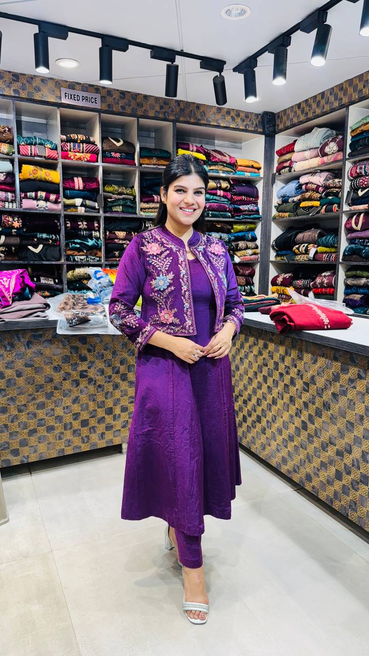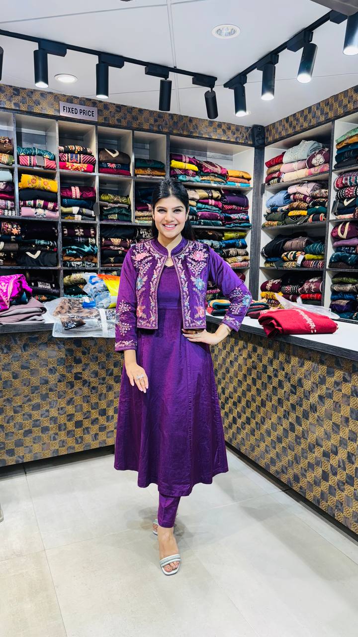 Lurina is a Premium Cotrize 3-Piece ensemble in a rich royal purple tone, designed to stand out with elegance and structure. The shirt features a smooth, flowy base enhanced by a beautifully embroidered short jacket, detailed with multicolour floral threadwork that adds depth and sophistication.
