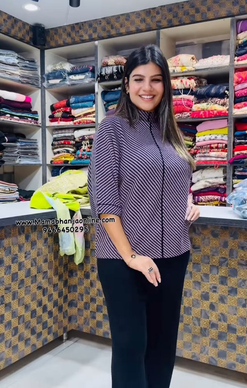 Elegant imported soft-knitting top featuring a diagonal chevron pattern in a classy blend of purple and black. Designed with a stand collar and half sleeves, this top perfectly balances comfort and sophistication — ideal for both casual and semi-formal wear.