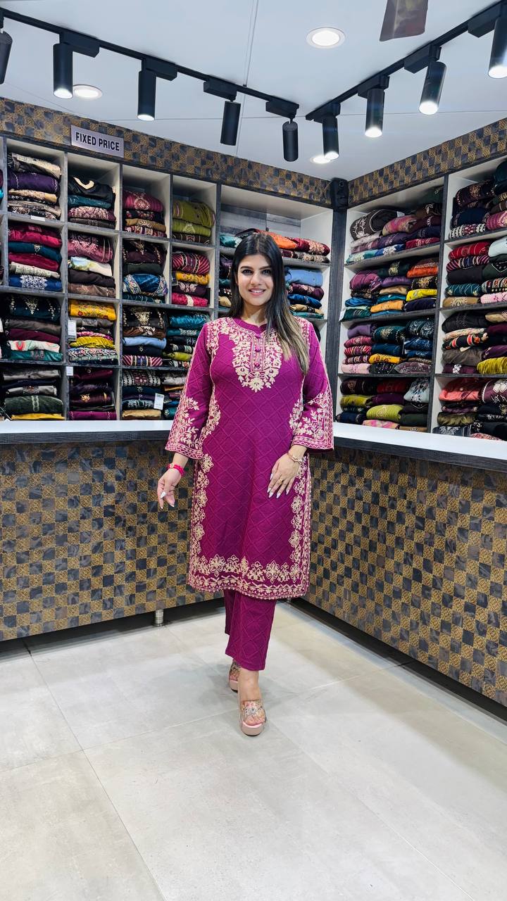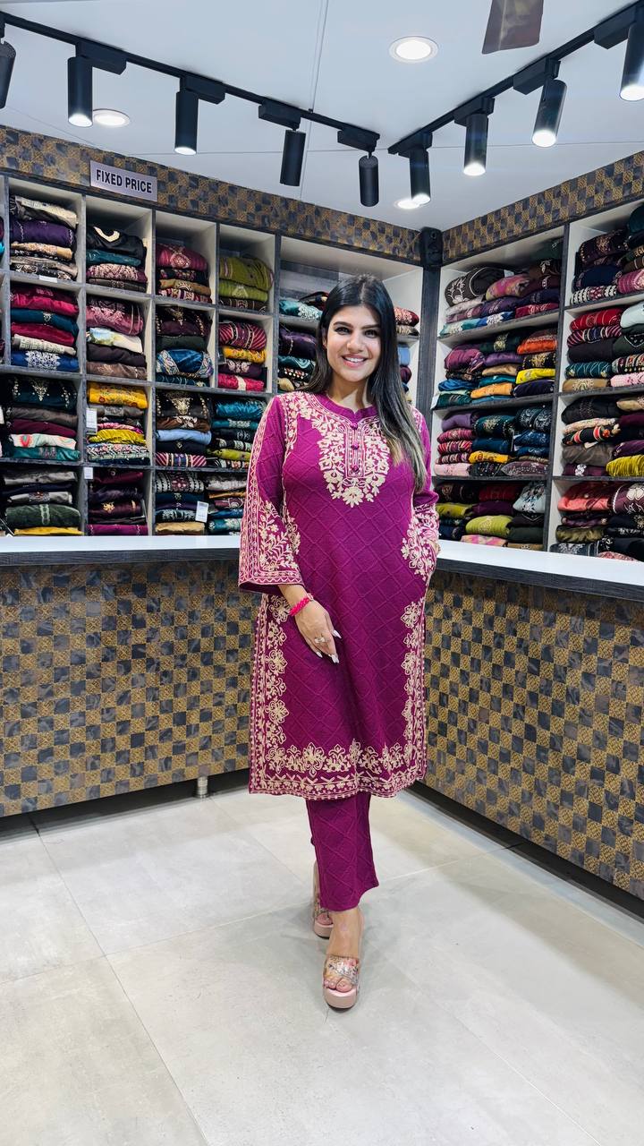 Magentara is a luxurious winter 2-piece set in a rich Magenta shade, finely detailed with elegant Golden ethnic embroidery. Premium soft & warm knitting fabric gives a plush and cozy winter feel.
